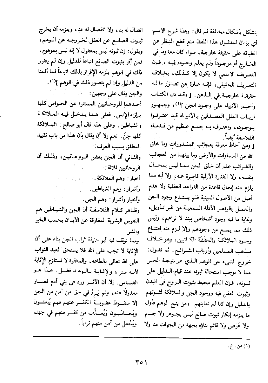 [وَمن أحَاط معرفَة بعجائب المقدورات وَمَا خلق الله من السَّمَاوَات وَالْأَرْض وَمَا بَينهمَا من الْعَجَائِب والغرائب علم أَن خلق الْجِنّ مِمَّا لَيْسَ بمحال بِنَفسِهِ، وَلَا الْقُدْرَة الأزلية قَاصِرَة عَنهُ، وَلَا أَنه مِمَّا يلْزم عَنهُ إبِْطَال قَاعِدَة من الْقَوَاعِد الْعَقْلِيَّة وَلَا هدم أصل من الْأُصُول الدِّينِيَّة فَلم يستدع وجود الْجِنّ وَالْعَمَل بظواهر الْأَدِلَّة السمعية من غير تَأْوِيل، وَغَايَة مَا فِيهِ وجود أشخاص بَيْننَا لَا نراهم، وَلَيْسَ ذَلِك مِمَّا يمْنَع من وجودهم وَإِلَّا لزم مِنْهُ امْتنَاع وجود الْمَلَائِكَة والحفظة الْكَاتِبين، وَهُوَ خلاف مَذْهَب الْمُسلمين وأرباب الشَّرَائِع ثمَّ نقُول: خُرُوج الشَّيْء عَن الْوَهم الَّذِي هُوَ نتيجة الْحس مِمَّا لَا يُوجب اسْتِحَالَة ثُبُوته عِنْد قيام الدَّلِيل على ثُبُوته، فَإِن الْعلم مُحِيط بِثُبُوت الرّوح فِي الْبدن وَثُبُوت الْعقل فِيهِ وَوُجُود الْجِنّ وَالْمَلَائِكَة لثبوتهم بِالدَّلِيلِ وَإِن كُنَّا لم نعاينهم وَمن يتبع الْوَهم فَأول مَا يلْزمه إِنْكَار ثُبُوت صانع لَيْسَ بجوهر وَلَا جسم وَلَا عرض وَلَا قَائِم بِنَاؤُه بِجِهَة من الْجِهَات منا وَلَا اتِّصَال لَهُ بِنَا، وَلَا انْفِصَال لَهُ عَنَّا، وَيلْزمهُ أَن يخرج ثُبُوت الصَّانِع عَن الْعقل لِخُرُوجِهِ عَن الْوَهم، وَيَقُول: إِن ثُبُوته لَيْسَ بمعقول لَا إِنَّه لَيْسَ بموهوم، فَمن أقرّ بِثُبُوت الصَّانِع اتبَاعا للدليل وَإِن لم يَتَقَرَّر ذَلِك فِي الْوَهم يلْزمه الْإِقْرَار بذلك اتبَاعا لما أَقَمْنَا من الدَّلِيل وَإِن لم يتَصَوَّر ذَلِك فِي الْوَهم]
