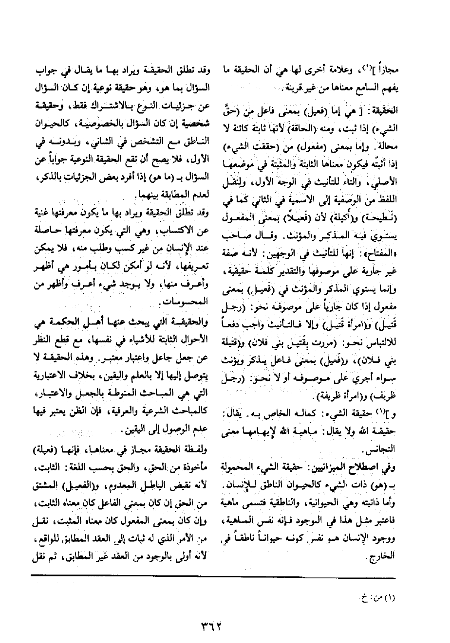 وَلَفْظَة الْحَقِيقَة مجَاز فِي مَعْنَاهَا، فَإِنَّهَا (فعلية) مَأْخُوذَة من الْحق، وَالْحق بِحَسب اللُّغَة: الثَّابِت، لِأَنَّهُ نقيض الْبَاطِل الْمَعْدُوم، و (الفعيل) الْمُشْتَقّ من الْحق إِن كَانَ بِمَعْنى الْفَاعِل كَانَ مَعْنَاهُ الثَّابِت، وَإِن كَانَ بِمَعْنى الْمَفْعُول كَانَ مَعْنَاهُ الْمُثبت، نقل من الْأَمر الَّذِي لَهُ ثبات إِلَى العقد المطابق للْوَاقِع، لِأَنَّهُ أولى بالوجود من العقد غير المطابق، ثمَّ نقل