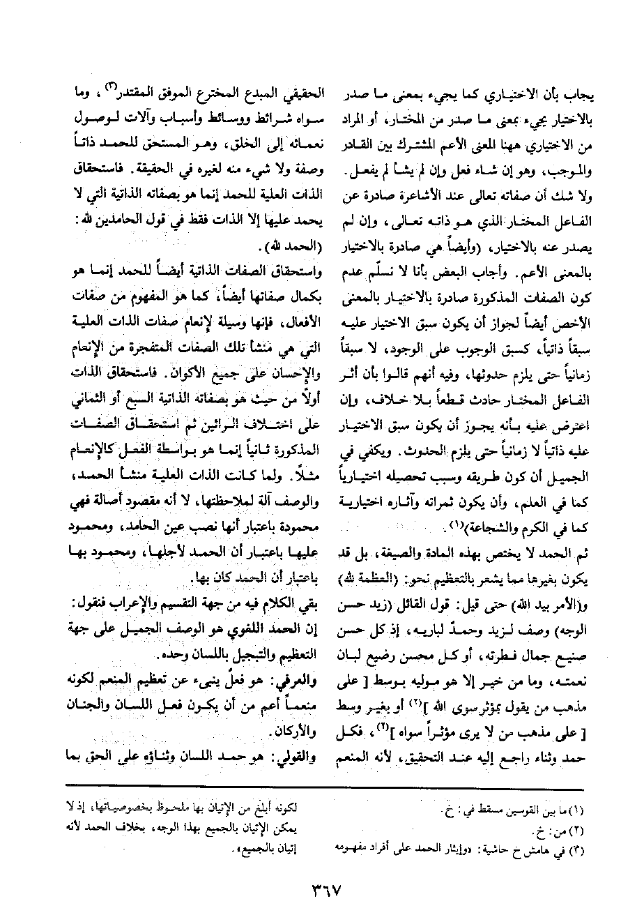 وَاسْتِحْقَاق الصِّفَات الذاتية أَيْضا للحمد إِنَّمَا هُوَ بِكَمَال صفاتها أَيْضا، كَمَا هُوَ الْمَفْهُوم من صِفَات الْأَفْعَال، فَإِنَّهَا وَسِيلَة لإنعام صِفَات الذَّات الْعلية الَّتِي هِيَ منشأ تِلْكَ الصِّفَات المتفجرة من الإنعام وَالْإِحْسَان على جَمِيع الأكوان فاستحقاق الذَّات أَولا من حَيْثُ هُوَ بصفاته الذاتية السَّبع أَو الثماني على اخْتِلَاف الرائين ثمَّ اسْتِحْقَاق الصِّفَات الْمَذْكُورَة ثَانِيًا إِنَّمَا هُوَ بِوَاسِطَة الْفِعْل كالإنعام مثلا وَلما كَانَت الذَّات الْعلية منشأ الْحَمد، وَالْوَصْف آلَة لملاحظتها، لَا أَنه مَقْصُود أَصَالَة فَهِيَ محمودة بِاعْتِبَار أَنَّهَا نصب عين الحامد، ومحمود عَلَيْهَا بِاعْتِبَار أَن الْحَمد لأَجلهَا، ومحمود بهَا بِاعْتِبَار أَن الْحَمد كَانَ بهَا