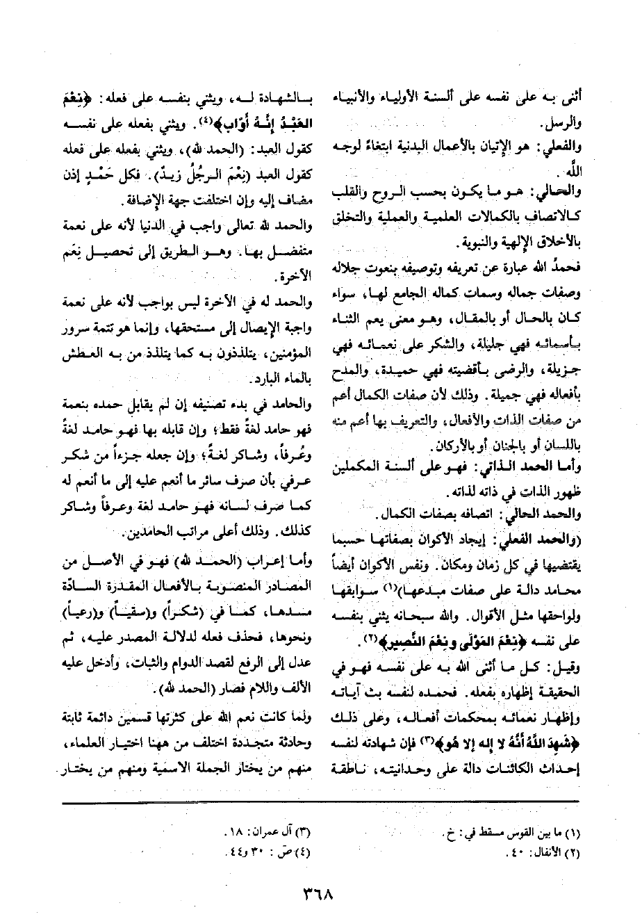 (وَالْحَمْد الْفعْلِيّ: إِيجَاد الأكوان بصفاتها حَسْبَمَا يقتضيها فِي كل زمَان وَمَكَان وَنَفس الأكوان أَيْضا محامد دَالَّة على صِفَات مبدعها) سوابقها ولواحقها مثل الْأَقْوَال وَالله سُبْحَانَهُ يثني بِنَفسِهِ على نَفسه {نعم الْمولى وَنعم النصير}