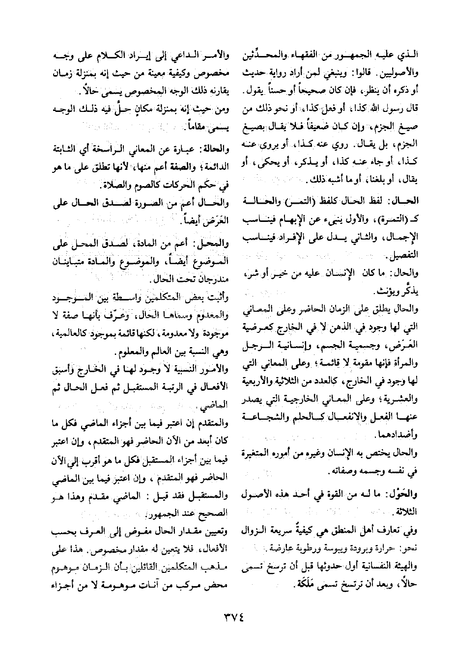وَالْحَال يُطلق على الزَّمَان الْحَاضِر وعَلى الْمعَانِي الَّتِي لَهَا وجود فِي الذِّهْن لَا فِي الْخَارِج كعرضية الْعرض، وجسمية الْجِسْم، وإنسانية الرجل وَالْمَرْأَة فَإِنَّهَا مقومة لَا قَائِمَة؛ وعَلى الْمعَانِي الَّتِي لَهَا وجود فِي الْخَارِج، كالعدد من الثلاثية والأربعية والعشرية؛ وعَلى الْمعَانِي الخارجية الَّتِي يصدر عَنْهَا الْفِعْل والانفعال كَالْحلمِ والشجاعة وأضدادهما