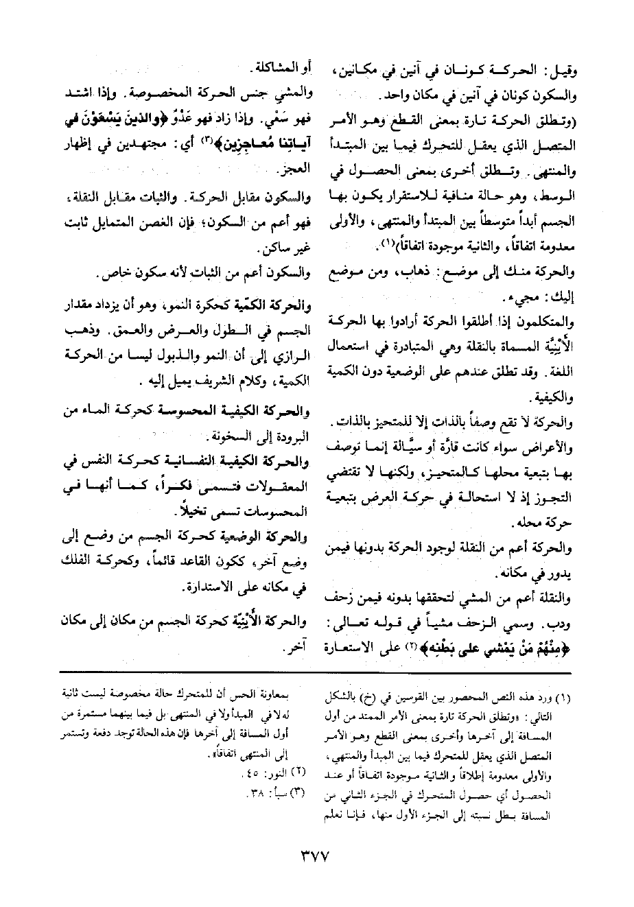 (وَتطلق الْحَرَكَة تَارَة بِمَعْنى الْقطع وَهُوَ الْأَمر الْمُتَّصِل الَّذِي يعقل للتحرك فِيمَا بَين الْمُبْتَدَأ والمتهى وَتطلق أُخْرَى بِمَعْنى الْحُصُول فِي الْوسط، وَهُوَ حَالَة مُنَافِيَة للاستقرار يكون بهَا الْجِسْم أبدا متوسطا بَين الْمُبْتَدَأ والمنتهى وَالْأولَى مَعْدُومَة اتِّفَاقًا، وَالثَّانيَِة مَوْجُودَة اتِّفَاقًا)