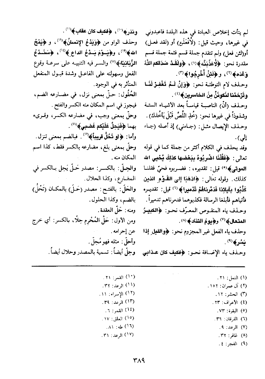 وَحذف يَاء الْإِضَافَة نَحْو: {فَكيف كَانَ عَذَابي وَنذر} ، {فَكيف كَانَ عِقَاب}