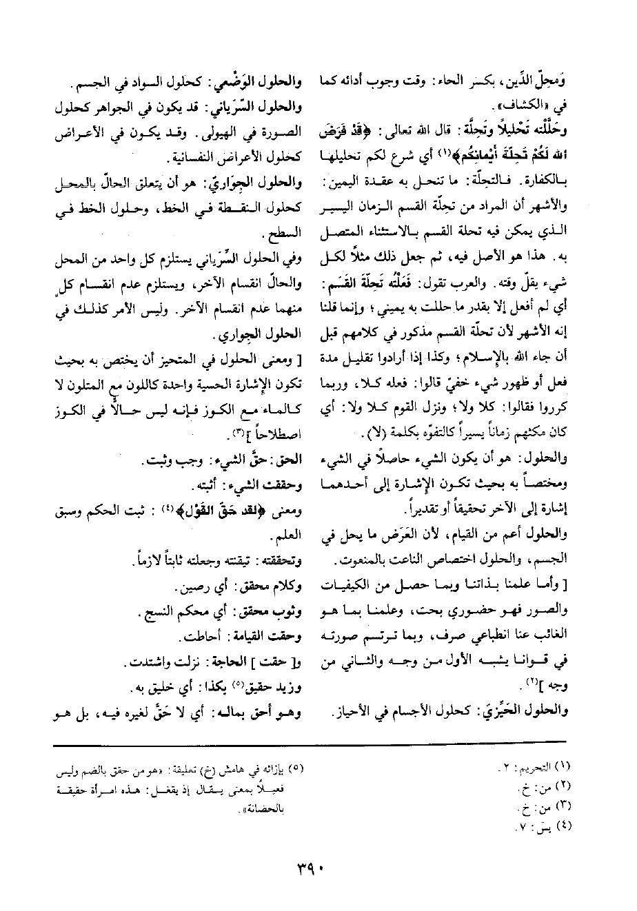 والحلول: هُوَ أَن يكون الشَّيْء حَاصِلا فِي الشَّيْء ومختصا بِهِ بِحَيْثُ تكون الْإِشَارَة إِلَى أَحدهمَا إِشَارَة إِلَى الآخر تَحْقِيقا أَو تَقْديرا