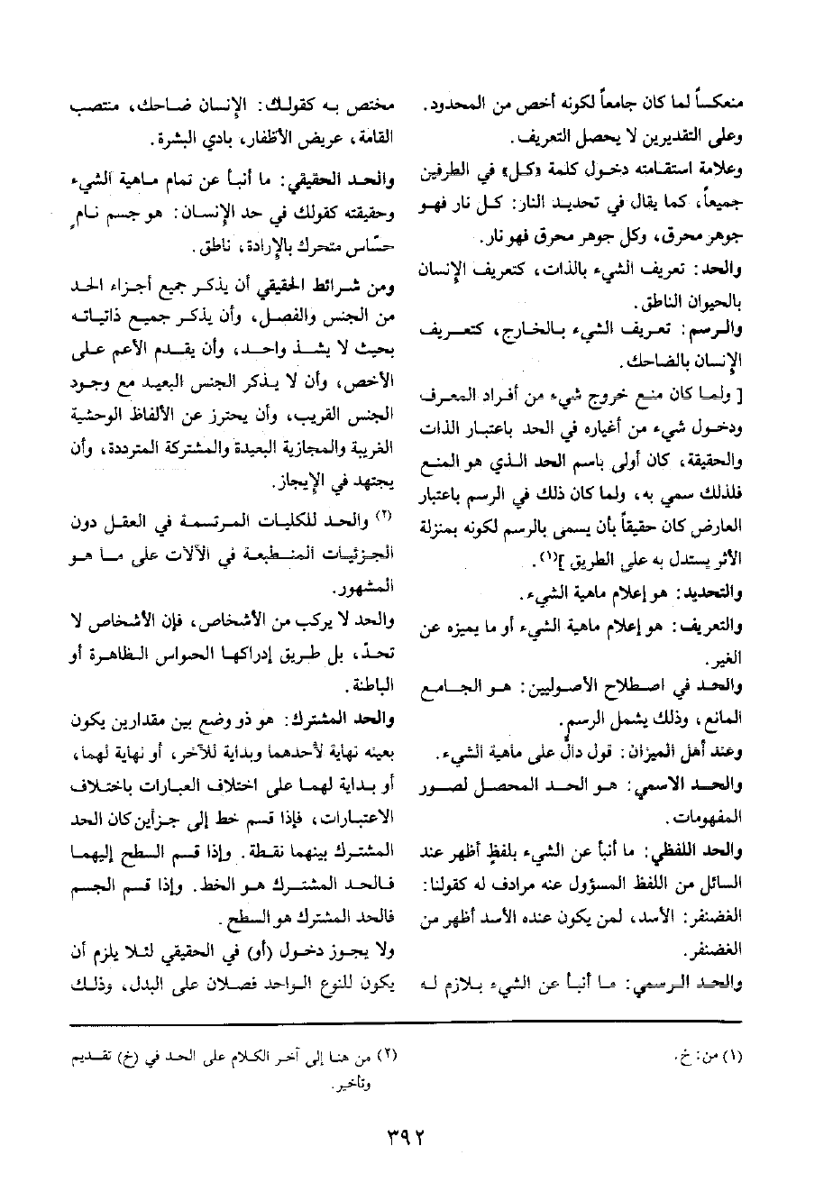 وَالْحَد الْحَقِيقِيّ: مَا أنبأ عَن تَمام مَاهِيَّة الشَّيْء وَحَقِيقَته كَقَوْلِك فِي حد الْإِنْسَان: هُوَ جسم نَام حساس متحرك بالإرادة، نَاطِق