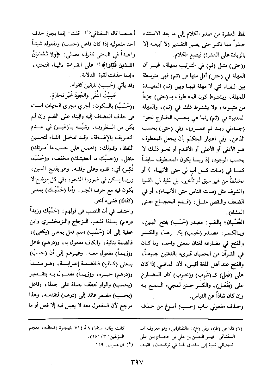 وَحذف مفعولي بَاب (حسب) أسوغ من حذف أَحدهمَا قَالَه السفناقي قلت: إِنَّمَا يجوز حذف أحد مفعوليه إِذا كَانَ فَاعل (حسب) ومفعوله شَيْئا وَاحِدًا فِي الْمَعْنى كَقَوْلِه تَعَالَى: {وَلَا تحسبن اللَّذين قتلوا} على الْقِرَاءَة بِالْيَاءِ التَّحْتِيَّة، وَإِنَّمَا حذفت لقُوَّة الدّلَالَة