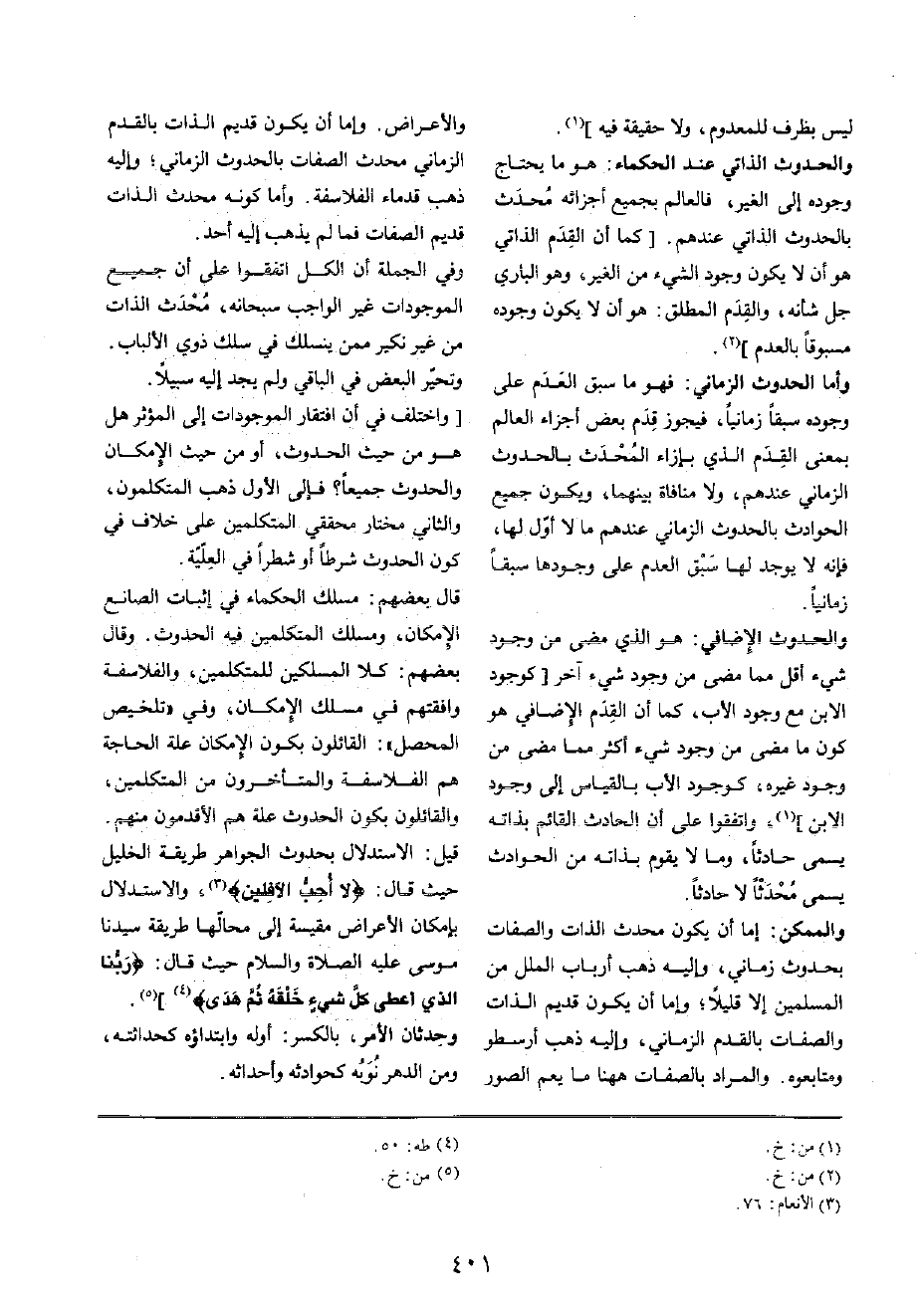 والممكن: إِمَّا أَن يكون مُحدث الذَّات وَالصِّفَات بحدوث زماني، وَإِلَيْهِ ذهب أَرْبَاب الْملَل من الْمُسلمين إِلَّا قَلِيلا؛ وَإِمَّا أَن يكون قديم الذَّات وَالصِّفَات بالقدم الزماني، وَإِلَيْهِ ذهب أرسطو ومتابعوه، وَالْمرَاد بِالصِّفَاتِ هَهُنَا مَا يعم الصُّور والأعراض وَإِمَّا أَن يكون قديم الذَّات بالقدم الزماني مُحدث الصِّفَات بالحدوث الزماني؛ وَإِلَيْهِ ذهب قدماء الفلاسفة وَأما كَونه مُحدث الذَّات قديم الصِّفَات فَمَا لم يذهب إِلَيْهِ أحد