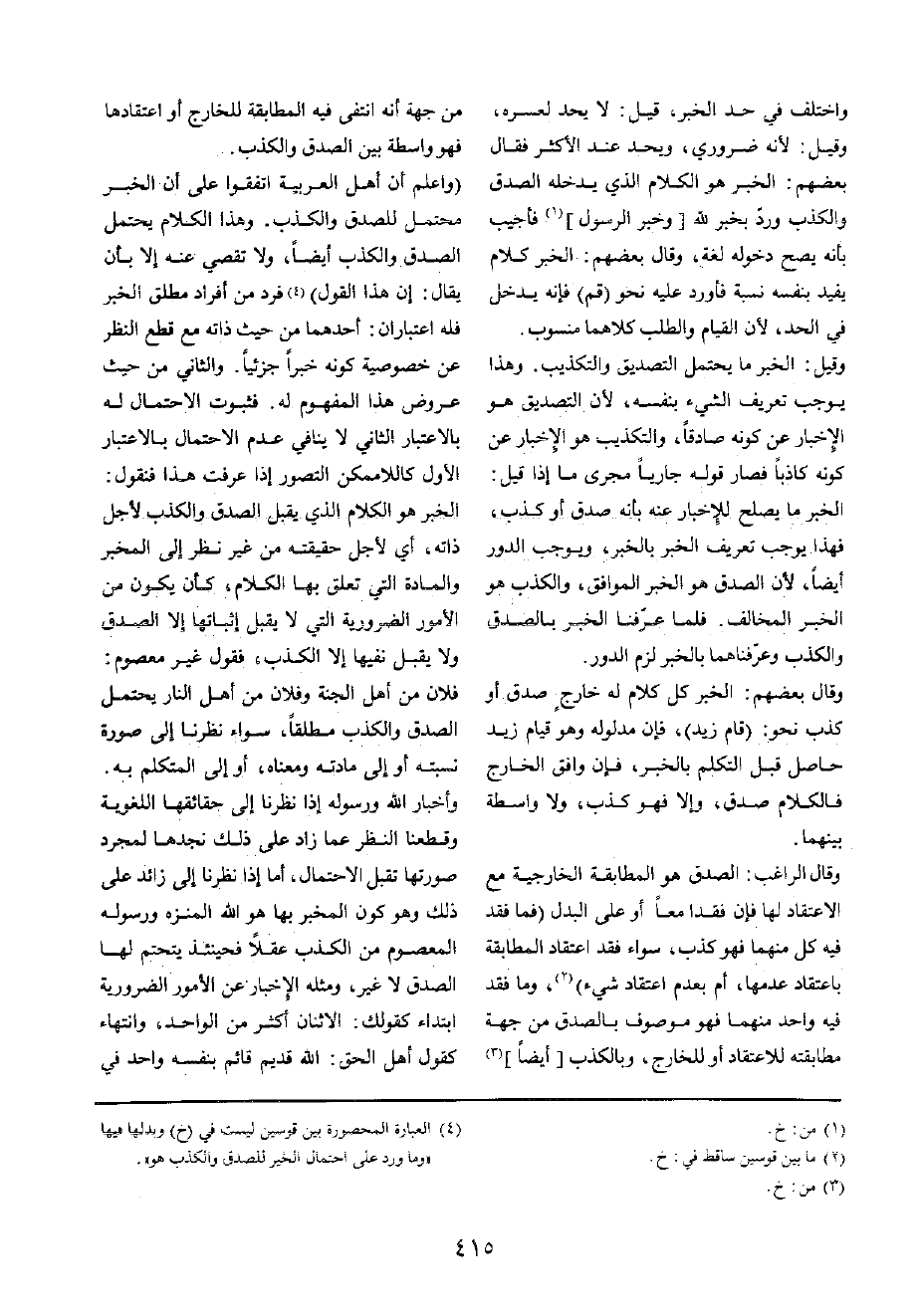 (وَاعْلَم أَن أهل الْعَرَبيَّة اتَّفقُوا على أَن الْخَبَر مُحْتَمل للصدق وَالْكذب وَهَذَا الْكَلَام يحْتَمل الصدْق وَالْكذب أَيْضا، وَلَا تقصي عَنهُ إِلَّا بِأَن يُقَال: إِن هَذَا القَوْل) فَرد من أَفْرَاد مُطلق الْخَبَر فَلهُ اعتباران: أَحدهمَا من حَيْثُ ذَاته مَعَ قطع النّظر عَن خُصُوصِيَّة كَونه خَبرا جزئيا وَالثَّانِي من حَيْثُ عرُوض هَذَا الْمَفْهُوم لَهُ فثبوت الِاحْتِمَال لَهُ بِالِاعْتِبَارِ الثَّانِي لَا يُنَافِي عدم الِاحْتِمَال بِالِاعْتِبَارِ الأول كاللاممكن التَّصَوُّر إِذا عرفت هَذَا فَنَقُول: الْخَبَر هُوَ الْكَلَام الَّذِي يقبل الصدْق وَالْكذب لأجل ذَاته، أَي لأجل حَقِيقَته من غير نظر إِلَى الْمخبر والمادة الَّتِي تعلق بهَا الْكَلَام، كَأَن يكون من الْأُمُور الضرورية الَّتِي لَا يقبل إِثْبَاتهَا إِلَّا الصدْق وَلَا يقبل نَفيهَا إِلَّا الْكَذِب، فَقَوْل غير مَعْصُوم: فلَان من أهل الْجنَّة وَفُلَان من أهل النَّار يحْتَمل الصدْق وَالْكذب مُطلقًا، سَوَاء نَظرنَا إِلَى صُورَة نسبته أَو إِلَى مادته وَمَعْنَاهُ، أَو إِلَى الْمُتَكَلّم بِهِ