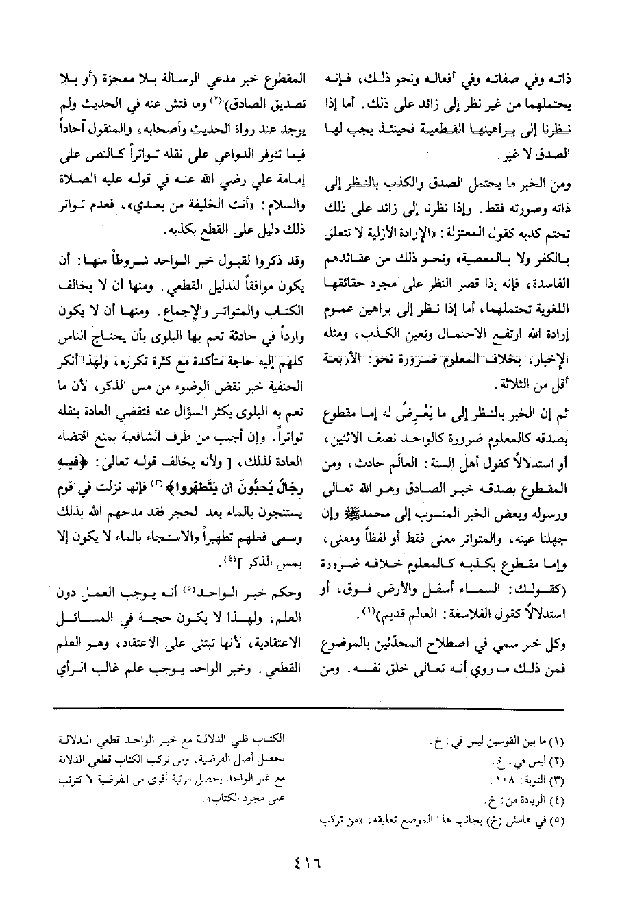 وَمن الْخَبَر مَا يحْتَمل الصدْق وَالْكذب بِالنّظرِ إِلَى ذَاته وَصورته فَقَط وَإِذا نَظرنَا إِلَى زَائِد على ذَلِك تحتم كذبه كَقَوْل الْمُعْتَزلَة: " الْإِرَادَة الأزلية لَا تتَعَلَّق بالْكفْر وَلَا بالمعصية " وَنَحْو ذَلِك من عقائدهم الْفَاسِدَة، فَإِنَّهُ إِذا قصر النّظر على مُجَرّد حقائقها اللُّغَوِيَّة تحتملهما، أما إِذا نظر إِلَى براهين عُمُوم إِرَادَة الله ارْتَفع الِاحْتِمَال وَتعين الْكَذِب، وَمثله الْإِخْبَار، بِخِلَاف الْمَعْلُوم ضَرُورَة نَحْو: الْأَرْبَعَة أقل من الثَّلَاثَة