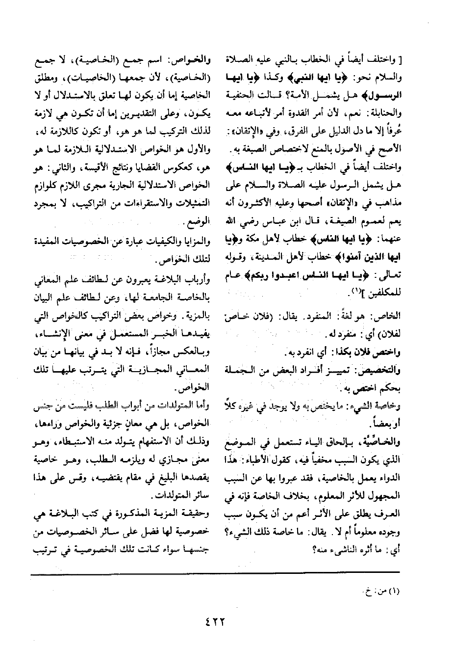 والخواص: اسْم جمع (الخاصية) ، لَا جمع (الخاصية) ، لِأَن جمعهَا (الخاصيات) ، وَمُطلق الخاصية إِمَّا أَن يكون لَهَا تعلق بالاستدلال أَو لَا يكون، وعَلى التَّقْدِيرَيْنِ إِمَّا أَن تكون هِيَ لَازِمَة لذَلِك التَّرْكِيب لما هُوَ هُوَ، أَو تكون كاللازمة لَهُ، وَالْأول هُوَ الْخَواص الاستدلالية اللَّازِمَة لما هُوَ هُوَ، كعكوس القضايا ونتائج الأقيسة، وَالثَّانِي: هُوَ الْخَواص الاستدلالية الْجَارِيَة مجْرى اللَّازِم كلوازم التمثيلات والاستقراءات من التراكيب، لَا بِمُجَرَّد الْوَضع