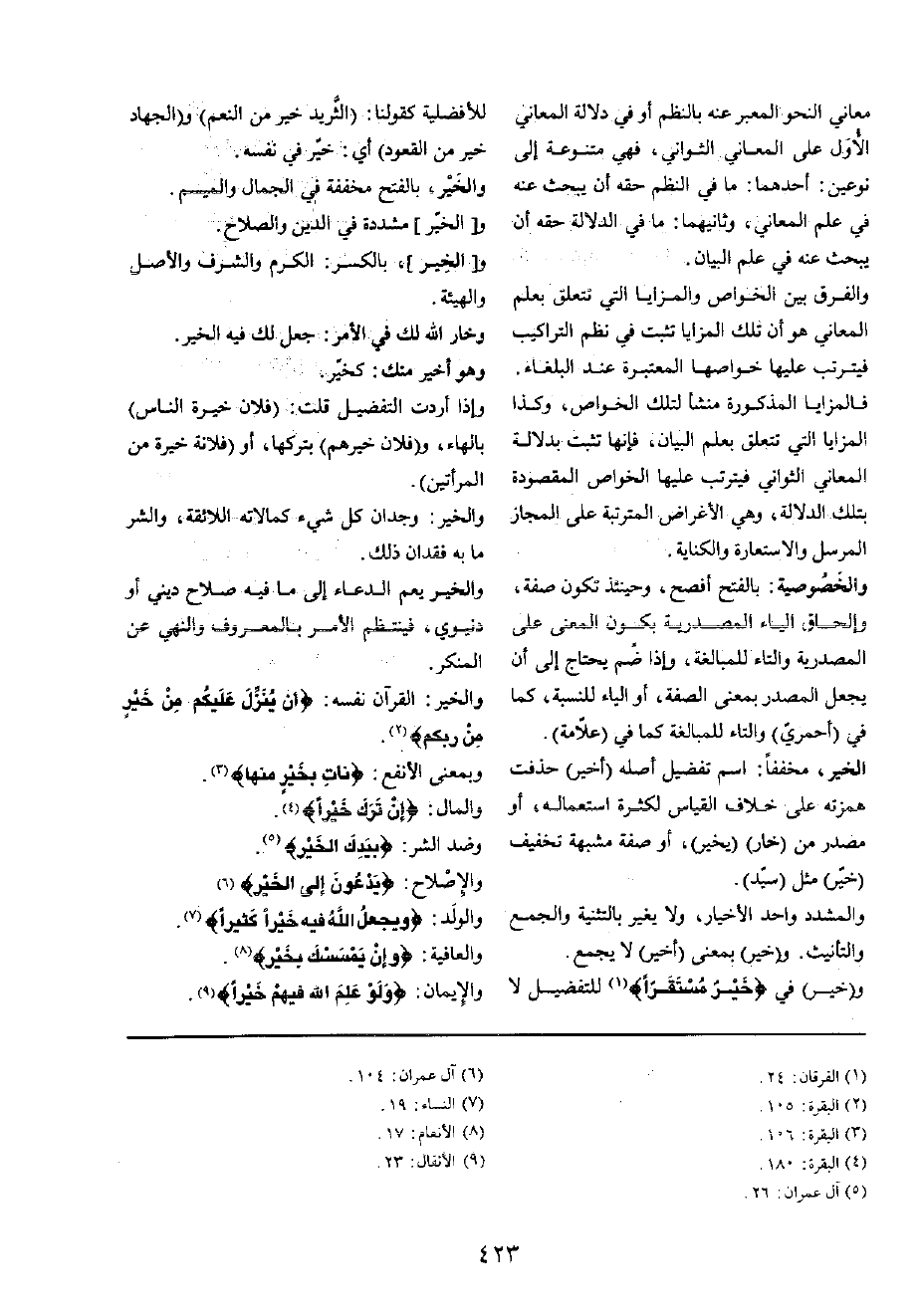الْخَيْر، مخففا: اسْم تَفْضِيل أَصله (أخبر) حذفت همزته على خلاف الْقيَاس لِكَثْرَة اسْتِعْمَاله، أَو مصدر من (خار) (يُخَيّر) ، أَو صفة مشبهة تَخْفيف (خير) مثل (سيد)