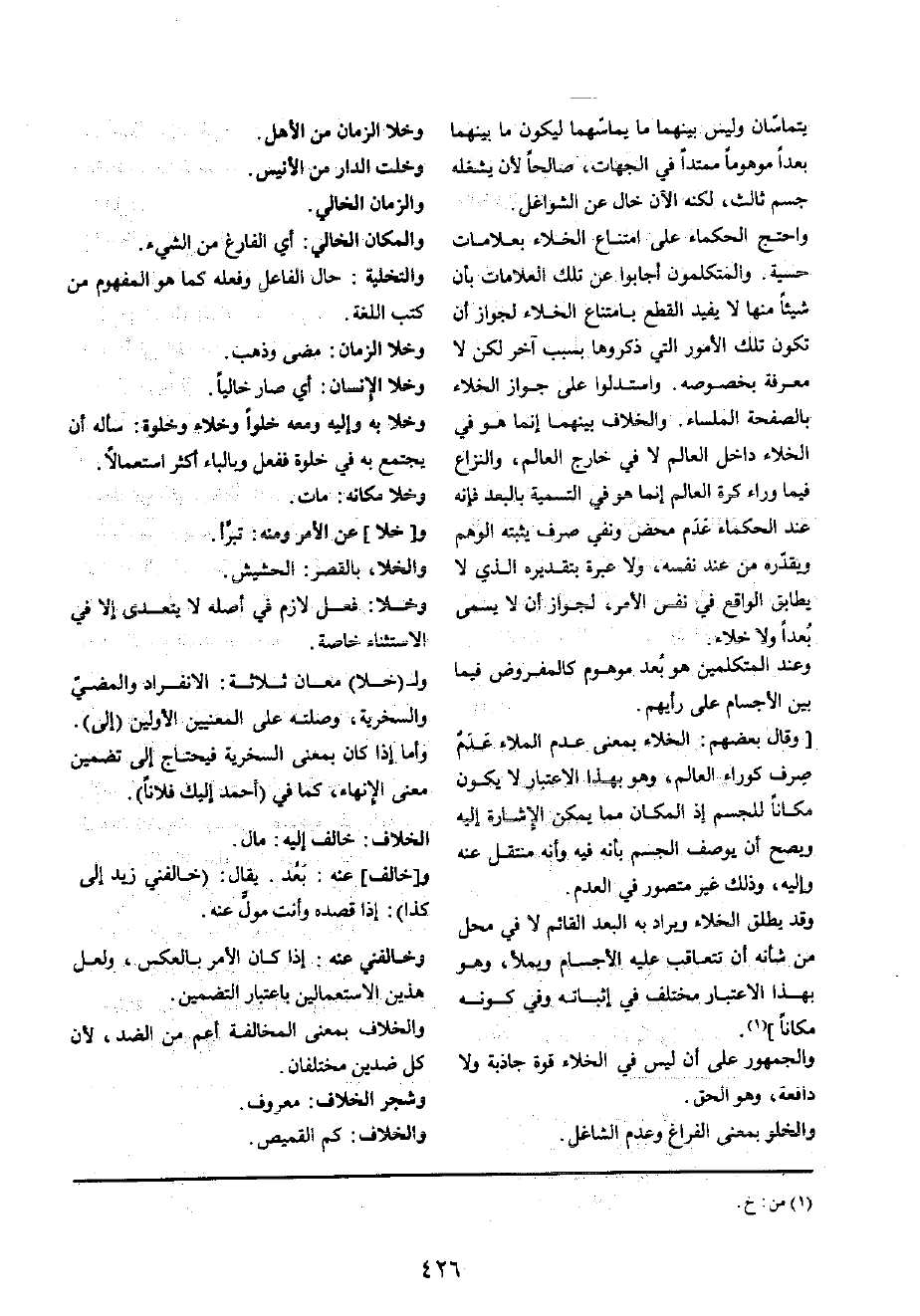 [وَقَالَ بَعضهم: الْخَلَاء بِمَعْنى عدم الملاء عدم صرف كوراء الْعَالم، وَهُوَ بِهَذَا الِاعْتِبَار لَا يكون مَكَانا للجسم إِذْ الْمَكَان مِمَّا يُمكن الْإِشَارَة إِلَيْهِ وَيصِح أَن يُوصف الْجِسْم بِأَنَّهُ فِيهِ وَأَنه منتقل عَنهُ وَإِلَيْهِ، وَذَلِكَ غير مُتَصَوّر فِي الْعَدَم