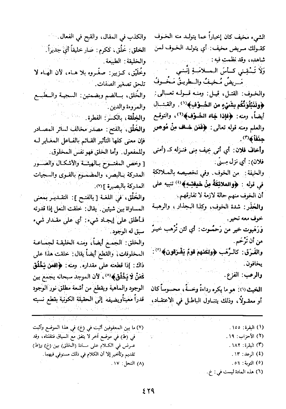 وَالْخَوْف: الْقَتْل، قيل: وَمِنْه قَوْله تَعَالَى: {ولنبلونكم بِشَيْء من الْخَوْف} والقتال أَيْضا، وَمِنْه: {فَإِذا جَاءَ الْخَوْف} ، والتوقع وَالْعلم وَمِنْه قَوْله تَعَالَى: {فَمن خَافَ من موص جنفا}