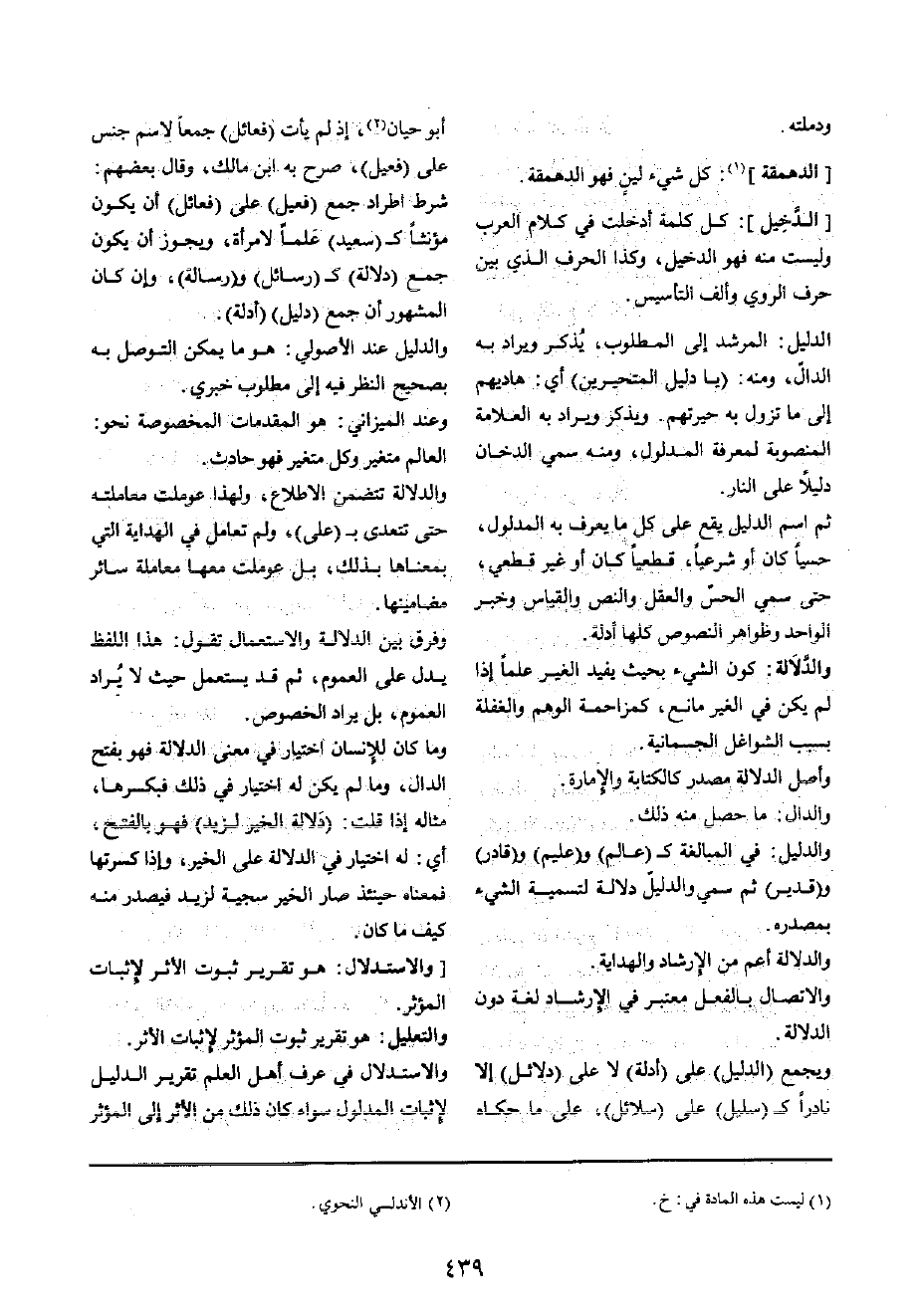 الدَّلِيل: المرشد إِلَى الْمَطْلُوب، يذكر وَيُرَاد بِهِ الدَّال، وَمِنْه: (يَا دَلِيل المتحيرين) أَي: هاديهم إِلَى مَا تَزُول بِهِ حيرتهم وَيذكر وَيُرَاد بِهِ الْعَلامَة المنصوبة لمعْرِفَة الْمَدْلُول، وَمِنْه سمي الدُّخان دَلِيلا على النَّار