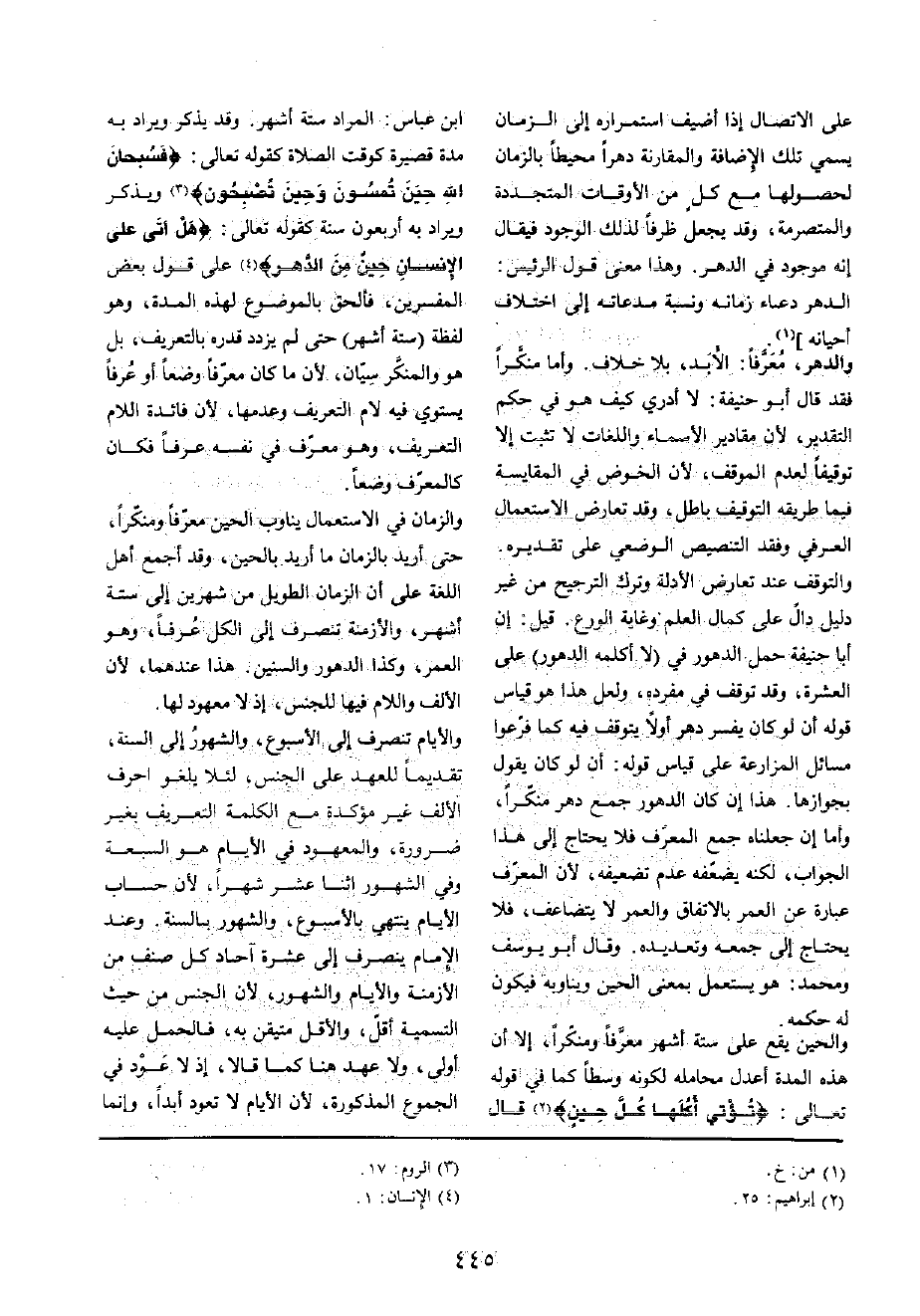 وَالزَّمَان فِي الِاسْتِعْمَال يناوب الْحِين مُعَرفا ومنكرا، حَتَّى أُرِيد بِالزَّمَانِ مَا أُرِيد بالحين، وَقد أجمع أهل اللُّغَة على أَن الزَّمَان الطَّوِيل من شَهْرَيْن إِلَى سِتَّة أشهر، والأزمنة تَنْصَرِف إِلَى الْكل عرفا، وَهُوَ الْعُمر، وَكَذَا الدهور والسنين هَذَا عِنْدهمَا، لِأَن الْألف وَاللَّام فِيهَا للْجِنْس، إِذْ لَا مَعْهُود لَهَا