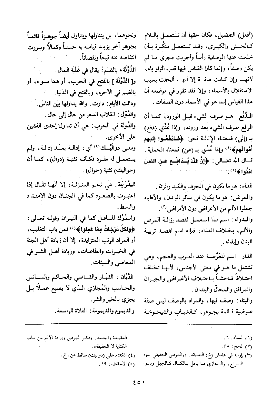 الدّفع: هُوَ صرف الشَّيْء قبل الْوُرُود، كَمَا أَن الرّفْع صرف الشَّيْء بعد وُرُوده، وَإِذا عدي (دفع) ب (إِلَى) فَمَعْنَاه الإنالة نَحْو: {فادفعوا إِلَيْهِم أَمْوَالهم} وَإِذا عدي ب (عَن) فَمَعْنَاه الحماية