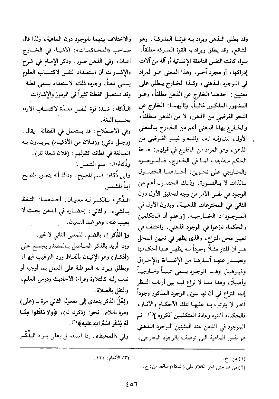 وَقد يُطلق الذِّهْن وَيُرَاد بِهِ قوتنا المدركة، وَهُوَ الشَّائِع، وَقد يُطلق وَيُرَاد بِهِ الْقُوَّة المدركة مُطلقًا، سَوَاء كَانَت النَّفس الناطقة الإنسانية أَو آلَة من آلَات إِدْرَاكهَا، أَو مُجَرّد آخر، وَهَذَا الْمَعْنى هُوَ المُرَاد فِي الْوُجُود الذهْنِي، وَكَذَا الْخَارِج يُطلق على مَعْنيين: أَحدهمَا الْخَارِج عَن الذِّهْن مُطلقًا، وَهُوَ الْمَشْهُور الْمَذْكُور غَائِبا، وَثَانِيهمَا: الْخَارِج عَن النَّحْو الفرضي من الذِّهْن، لَا من الذِّهْن مُطلقًا، وَالْخَارِج بِهَذَا الْمَعْنى أَعم من الْخَارِج بِالْمَعْنَى الأول، لتنَاوله لَهُ، وللنحو غير الفرضي من الذِّهْن، وَهُوَ المُرَاد من الْخَارِج فِي قَوْلهم: صِحَة الحكم مطابقته لما فِي الْخَارِج، فالموجود والخارجي على نحوين: أَحدهمَا الْحُصُول بِالذَّاتِ لَا بالصورة، وَذَلِكَ الْحُصُول أَعم من الْوُجُود فِي نفس الْأَمر من وَجه لتحقيق الأول دون الثَّانِي فِي المخترعات الذهنية، وَبِدُون الأول فِي الموجودات الخارجية. [وَاعْلَم أَن الْمُتَكَلِّمين والحكماء نازعوا فِي الْوُجُود الذهْنِي، وَاخْتلف فِي تعْيين مَحل النزاع، وَالَّذِي يظْهر فِي تعْيين الْمحل هُوَ أَن للنار مثلا وجودا بِهِ يظْهر عَنْهَا أَحْكَامهَا وتصدر عَنْهَا آثارها من الإضاءة والإحراق وَغَيرهمَا وَهَذَا الْوُجُود يُسمى عينيا وخارجيا وَأَصِيلا، وَهَذَا مِمَّا لَا نزاع فِيهِ بَين أَرْبَاب النّظر إِنَّمَا النزاع فِي أَن لَهَا سوى الْوُجُود الْمَذْكُور وجودا آخر لَا يَتَرَتَّب بِهِ عَلَيْهَا تِلْكَ الْأَحْكَام والْآثَار، فالحكماء أثبتوه وَعَامة الْمُتَكَلِّمين أنكروه] ثمَّ الْمَوْجُود فِي الذِّهْن عِنْد المثبتين الْوُجُود الذهْنِي هُوَ نفس الْمَاهِيّة الَّتِي تُوصَف بالوجود الْخَارِجِي، وَالِاخْتِلَاف بَينهمَا بالوجود دون الْمَاهِيّة، وَلذَا قَالَ صَاحب " المحاكمات ": الْأَشْيَاء فِي الْخَارِج أَعْيَان، وَفِي الذِّهْن صور وَذكر الإِمَام فِي شرح " الإشارات أَن استعداد النَّفس لِاكْتِسَابِ الْعُلُوم يُسمى ذهنا، وجودة ذَلِك الاستعداد يُسمى فطنة