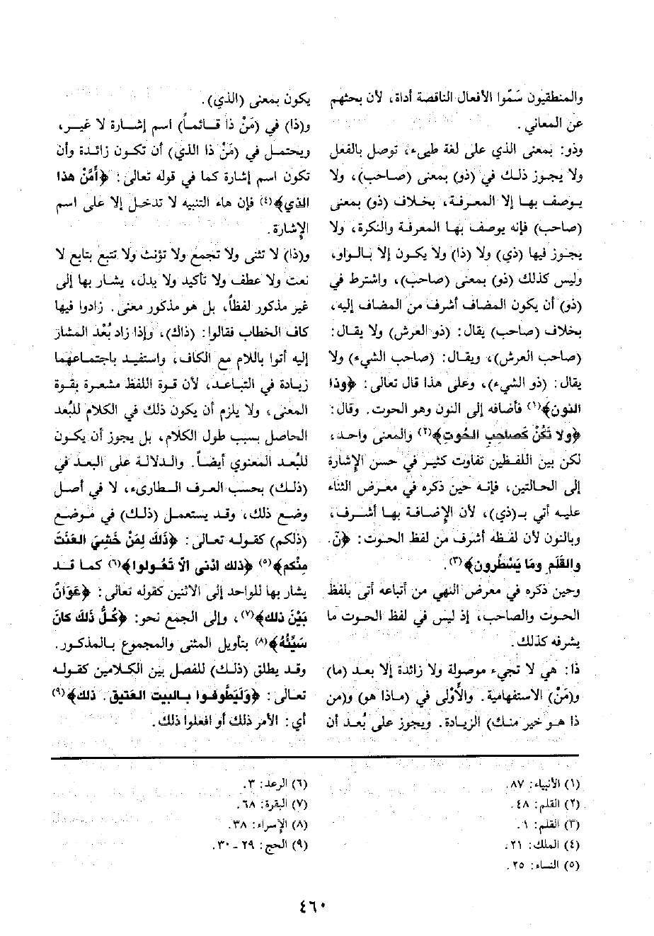 وَذُو: بِمَعْنى الَّذِي على لُغَة طَيئ، توصل بِالْفِعْلِ وَلَا يجوز ذَلِك فِي (ذُو) بِمَعْنى (صَاحب) ، وَلَا يُوصف بهَا إِلَّا الْمعرفَة، بِخِلَاف (ذُو) بِمَعْنى (صَاحب) فَإِنَّهُ يُوصف بهَا الْمعرفَة والنكرة، وَلَا يجوز فِيهَا (ذِي) وَلَا (ذَا) وَلَا يكون إِلَّا بِالْوَاو، وَلَيْسَ كَذَلِك (ذُو) بِمَعْنى (صَاحب) ، وَاشْترط فِي (ذُو) أَن يكون الْمُضَاف أشرف من الْمُضَاف إِلَيْهِ، بِخِلَاف (صَاحب) يُقَال: (ذُو الْعَرْش) وَلَا يُقَال: (صَاحب الْعَرْش) ، وَيُقَال: (صَاحب الشَّيْء) وَلَا يُقَال: (ذُو الشَّيْء) ، وعَلى هَذَا قَالَ تَعَالَى: {وَذَا النُّون} فأضافه إِلَى النُّون وَهُوَ الْحُوت وَقَالَ: {وَلَا تكن تصاحب الْحُوت} وَالْمعْنَى وَاحِد، لَكِن بَين اللَّفْظَيْنِ تفَاوت كثير فِي حسن الْإِشَارَة إِلَى الْحَالَتَيْنِ، فَإِنَّهُ حِين ذكره فِي معرض الثَّنَاء عَلَيْهِ أُتِي ب (ذِي) ، لِأَن الْإِضَافَة بهَا أشرف، وبالنون لِأَن لَفظه أشرف من لفظ الْحُوت: {ن والقلم وَمَا يسطرون}