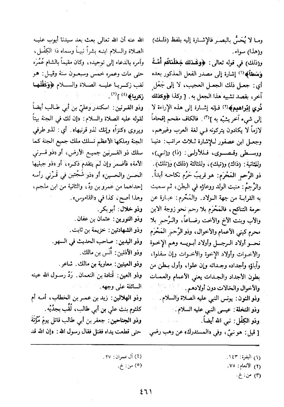 و (ذَلِك) فِي قَوْله تَعَالَى: {وَكَذَلِكَ جَعَلْنَاكُمْ أمة وسطا} إِشَارَة إِلَى مصدر الْفِعْل الْمَذْكُور بعده أَي: جعل ذَلِك الْجعل العجيب، لَا إِلَى جعل آخر، بِقصد تَشْبِيه هَذَا الْجعل بِهِ [وَكَذَا {وَكَذَلِكَ نري إِبْرَاهِيم} فَإِنَّهُ إِشَارَة إِلَى هَذِه الإراءة لَا إِلَى شَيْء آخر يشبه بِهِ] فالكاف مقحم إقحاما لَازِما لَا يكادون يتركونه فِي لُغَة الْعَرَب وَغَيرهم، وَجعل ابْن عُصْفُور للْإِشَارَة ثَلَاث مَرَاتِب: دنيا ووسطى وقصوى، فللأولى: (ذَا) و (تي) ، وللثانية: (ذَاك) و (تيك) ، وللثالثة (ذَلِك) و (تِلْكَ)