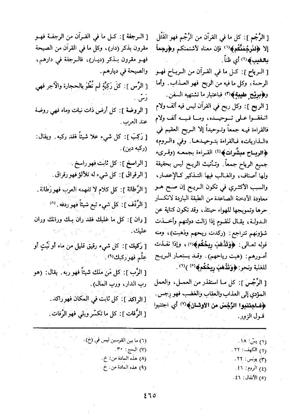[الرّيح] : وكل ريح فِي الْقُرْآن لَيْسَ فِيهِ ألف وَلَام اتَّفقُوا على توحيده، وَمَا فِيهِ ألف وَلَام فالقراءة فِيهِ جمعا وتوحيدا إِلَّا الرّيح الْعَقِيم فِي " الذاريات " فالقراءة بتوحيدها وَفِي " الرّوم " {الرِّيَاح مُبَشِّرَات} الْقِرَاءَة بجمعه (وقرىء جَمِيع الرِّيَاح جمعا وتأنيث الرّيح لَيْسَ بِحَقِيقَة وَلها أَصْنَاف، وَالْغَالِب فِيهَا التَّذْكِير كالإعصار، وَالسَّبَب الأكثري فِي تكون الرّيح إِن صَحَّ هُوَ معاودة الأدخنة الصاعدة من الطَّبَقَة الْبَارِدَة لانكسار حرهَا وتمويجها للهواء حِينَئِذٍ، وَقد تكون كِنَايَة عَن الدولة، يُقَال للْقَوْم إِذا زَالَت دولتهم وَأخذت شؤونهم تتراجع: (ركدت ريحهم وَذَهَبت) ، وَمِنْه قَوْله تَعَالَى: {وَتذهب ريحكم} ، وَإِذا نفذت أُمُورهم: (هبت رياحهم) وَقد يستعار الرّيح للغلبة وَنَحْو: {وَتذهب ريحكم} .