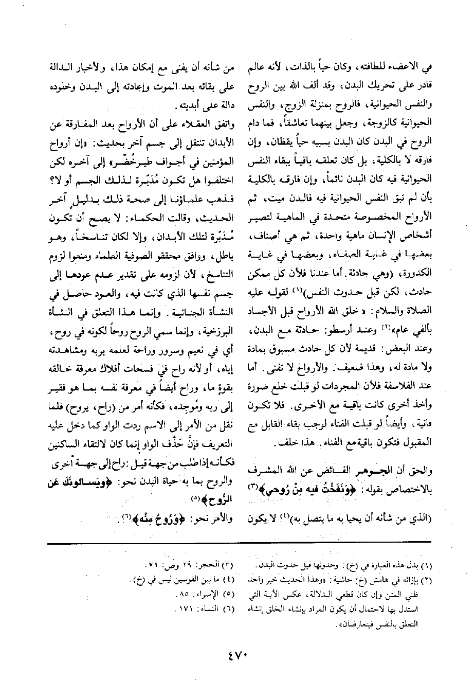 (الَّذِي من شَأْنه أَن يحيا بِهِ مَا يتَّصل بِهِ) لَا يكون من شَأْنه أَن يفنى مَعَ إِمْكَان هَذَا، وَالْأَخْبَار الدَّالَّة على بَقَائِهِ بعد الْمَوْت وإعادته إِلَى الْبدن وخلوده دَالَّة على أبديته