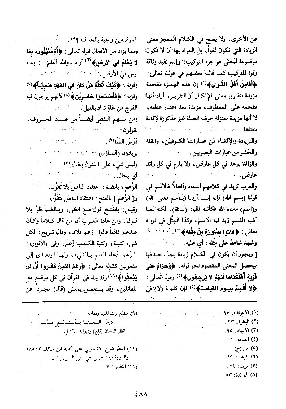 [وَيجوز أَن يكون فِي الْكَلَام زِيَادَة يجب حذفهَا ليحصل الْمَعْنى الْمَقْصُود نَحْو قَوْله: {وَحرَام على قَرْيَة أهلكناها أَنهم لَا يرجعُونَ} وَقَوله تَعَالَى: {لَا أقسم بِيَوْم الْقِيَامَة} فَإِن كلمة (لَا) فِي الْمَوْضِعَيْنِ وَاجِبَة بالحذف]