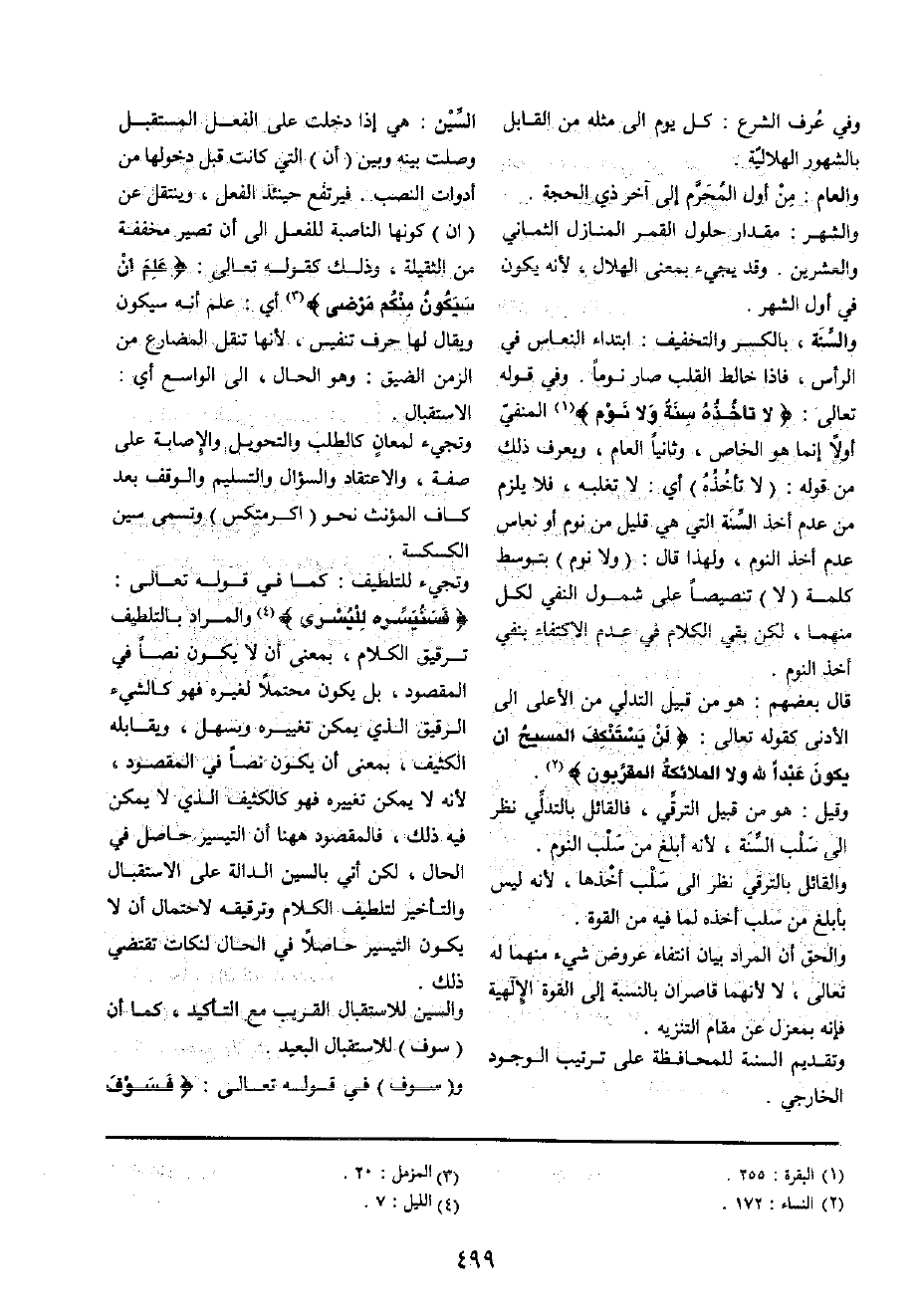 وَالسّنة، بِالْكَسْرِ وَالتَّخْفِيف: ابْتِدَاء النعاس فِي الرَّأْس، فاذا خالط الْقلب صَار نوما وَفِي قَوْله تَعَالَى: {لَا تَأْخُذهُ سنة وَلَا نوم} الْمَنْفِيّ أَولا إِنَّمَا هُوَ الْخَاص، وَثَانِيا الْعَام، وَيعرف ذَلِك من قَوْله: (لَا تَأْخُذهُ) أَي: لَا تغلبه، فَلَا يلْزم من عدم أَخذ السّنة الَّتِي هِيَ قَلِيل من نوم أَو نُعَاس عدم أَخذ النّوم، وَلِهَذَا قَالَ: (وَلَا نوم) بتوسط كلمة (لَا) تنصيصا على شُمُول النَّفْي لكل مِنْهُمَا، لَكِن بَقِي الْكَلَام فِي عدم الِاكْتِفَاء بِنَفْي أَخذ النّوم