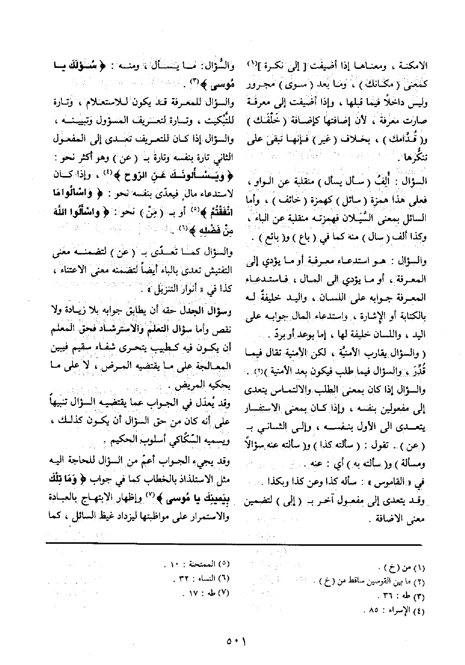 وَالسُّؤَال للمعرفة قد يكون للاستعلام، وَتارَة للتبكيت، وَتارَة لتعريف المسؤول وتبيينه، وَالسُّؤَال إِذا كَانَ للتعريف تعدى إِلَى الْمَفْعُول الثَّانِي تَارَة بِنَفسِهِ وَتارَة ب (عَن) وَهُوَ أَكثر نَحْو: {ويسألونك عَن الرّوح} ، وَإِذا كَانَ لاستدعاء مَال فيعدى بِنَفسِهِ نَحْو: {واسألوا مَا أنفقتم} أَو ب (من) نَحْو: {واسألوا الله من فَضله}