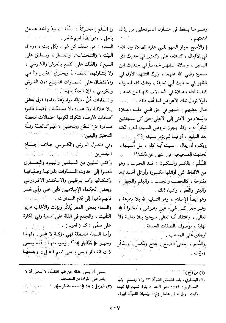 السَّمَاء: هِيَ سقف كل شَيْء وكل بَيت، ورواق الْبَيْت، والسحاب، والمطر، وَيُطلق على السَّبع، والفلك على التسع بالعرش والكرسي، وَلَا يتناولهما السَّمَاء، وَيجْرِي التَّغْيِير والطي والانشقاق على السَّمَوَات السَّبع دون الْعَرْش والكرسي، فَإِن الْجنَّة بَينهمَا