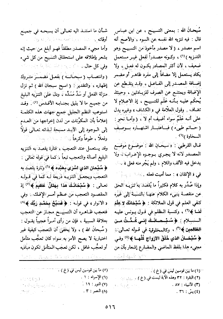 سُبْحَانَ الله، بِمَعْنى التَّسْبِيح، عَن ابْن عَبَّاس قَالَ: فِيهِ تَنْزِيه الله نَفسه عَن السوء، وَالأَصَح أَنه اسْم مصدر، (لَا مصدر مَأْخُوذ من التَّسْبِيح وَهُوَ التَّنْزِيه) ، وَكَونه مصدرا لفعل غير مُسْتَعْمل ضَعِيف، لِأَن أَكثر المصادر يكون لَهُ فعل، وَلَا يكَاد يسْتَعْمل إِلَّا مُضَافا إِلَى مُفْرد ظَاهر أَو مُضْمر إِضَافَة الْمصدر إِلَى الْفَاعِل، وَقد يَنْقَطِع عَن الْإِضَافَة وَيمْتَنع عَن الصّرْف للزيادتين، وَحِينَئِذٍ يحكم عَلَيْهِ بِأَنَّهُ علم التَّسْبِيح، إِذا الاعلام لَا تُضَاف وَقَول الْعَلامَة فِي " الْكَشَّاف " وَغَيره يدل على أَنه علم سَوَاء أضيف أم لَا، (وَأما نَحْو: (حَاتِم طيىء) فباعتبار اشتهاره بِوَصْف السخاوة)