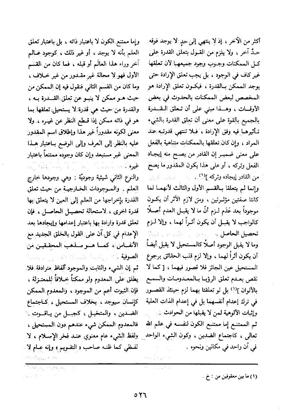 وَإِمَّا مُمْتَنع الْكَوْن لَا بِاعْتِبَار ذَاته، بل بِاعْتِبَار تعلق الْعلم بِأَنَّهُ لَا يُوجد، أَو غير ذَلِك، كوجود عَالم آخر وَرَاء هَذَا الْعَالم أَو قبله، فَمَا كَانَ من الْقسم الأول فَهُوَ لَا محَالة غير مَقْدُور من غير خلاف، وَمَا كَانَ من الْقسم الثَّانِي فَنَقُول فِيهِ إِن الْمُمكن من حَيْثُ هُوَ مُمكن لَا ينبو عَن تعلق الْقُدْرَة بِهِ، وَالْقُدْرَة من حَيْثُ هِيَ قدرَة لَا يَسْتَحِيل تعلقهَا بِمَا هُوَ فِي ذَاته مُمكن إِذا قطع النّظر عَن غَيره، وَلَا معنى لكَونه مَقْدُورًا غير هَذَا وَإِطْلَاق اسْم الْمَقْدُور عَلَيْهِ بِالنّظرِ إِلَى الْعرف وَإِلَى الْوَضع بِاعْتِبَار هَذَا الْمَعْنى غير مستبعد وَإِن كَانَ وجوده مُمْتَنعا بِاعْتِبَار غَيره