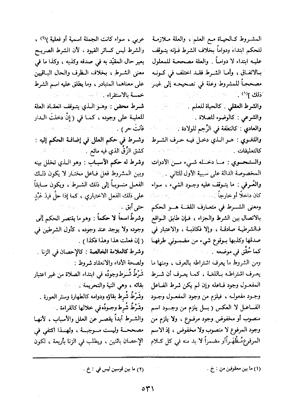 الْمَشْرُوط كالحياة مَعَ الْعلم، وَالْعلَّة مُلَازمَة للْحكم ابْتِدَاء ودواما بِخِلَاف الشَّرْط فَإِنَّهُ يتَوَقَّف عَلَيْهِ ابْتِدَاء لَا دواما وَالْعلَّة مصححة للمعلول بالِاتِّفَاقِ، وَأما الشَّرْط فقد اخْتلف فِي كَونه مصححا للمشروط وَعلة فِي تصححيه إِلَى غير ذَلِك]