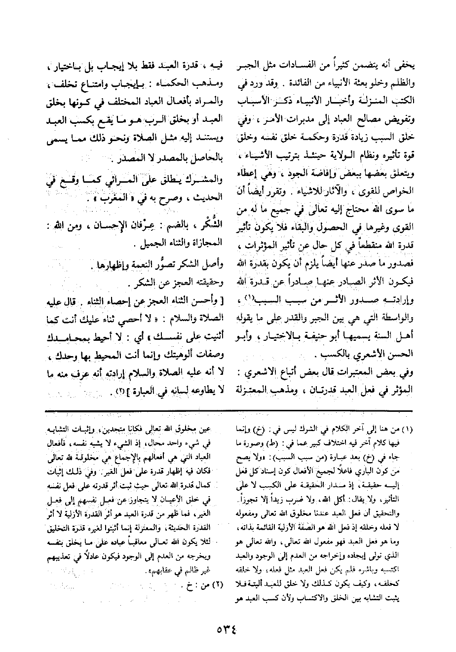 وَفِي بعض الْمُعْتَبرَات قَالَ بعض أَتبَاع الاشعري: الْمُؤثر فِي فعل العَبْد قدرتان، وَمذهب الْمُعْتَزلَة فِيهِ، قدرَة العَبْد فَقَط بِلَا إِيجَاب بل بِاخْتِيَار، وَمذهب الْحُكَمَاء: بِإِيجَاب وَامْتِنَاع تخلف، وَالْمرَاد بِأَفْعَال الْعباد الْمُخْتَلف فِي كَونهَا بِخلق العَبْد أَو بِخلق الرب هُوَ مَا يَقع بكسب العَبْد ويستند إِلَيْهِ مثل الصَّلَاة وَنَحْو ذَلِك مِمَّا يُسمى بالحاصل بِالْمَصْدَرِ لَا الْمصدر