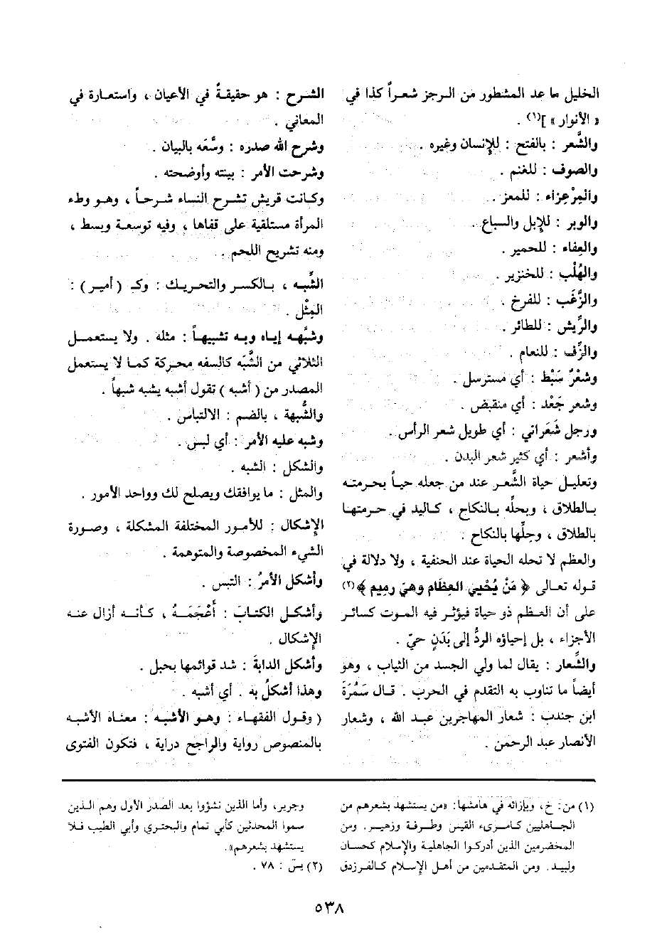 وَرجل شعراني: أَي طَوِيل شعر الرَّأْس وأشعر: أَي كثير شعر الْبدن. وتعليل حَيَاة الشّعْر عِنْد من جعله حَيا بحرمته بِالطَّلَاق، وبحله بِالنِّكَاحِ، كَالْيَدِ فِي حرمتهَا بِالطَّلَاق، وحلها بِالنِّكَاحِ