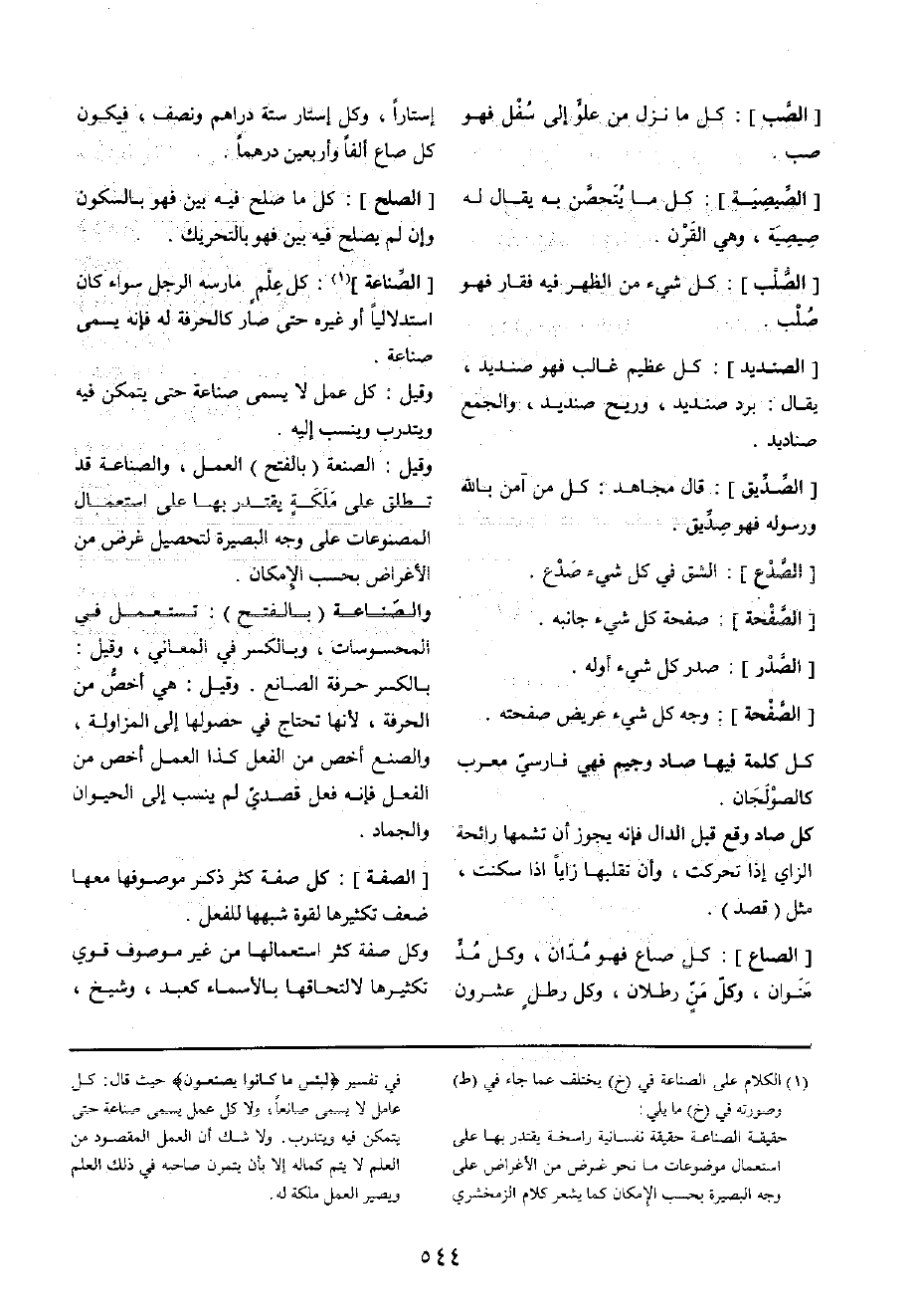 والصناعة (بِالْفَتْح) : تسْتَعْمل فِي المحسوسات، وبالكسر فِي الْمعَانِي، وَقيل: بِالْكَسْرِ حِرْفَة الصَّانِع وَقيل: هِيَ أخص من الحرفة، لِأَنَّهَا تحْتَاج فِي حُصُولهَا إِلَى المزاولة، والصنع أخص من الْفِعْل كَذَا الْعَمَل أخص من الْفِعْل فَإِنَّهُ فعل قصدي لم ينْسب إِلَى الْحَيَوَان والجماد