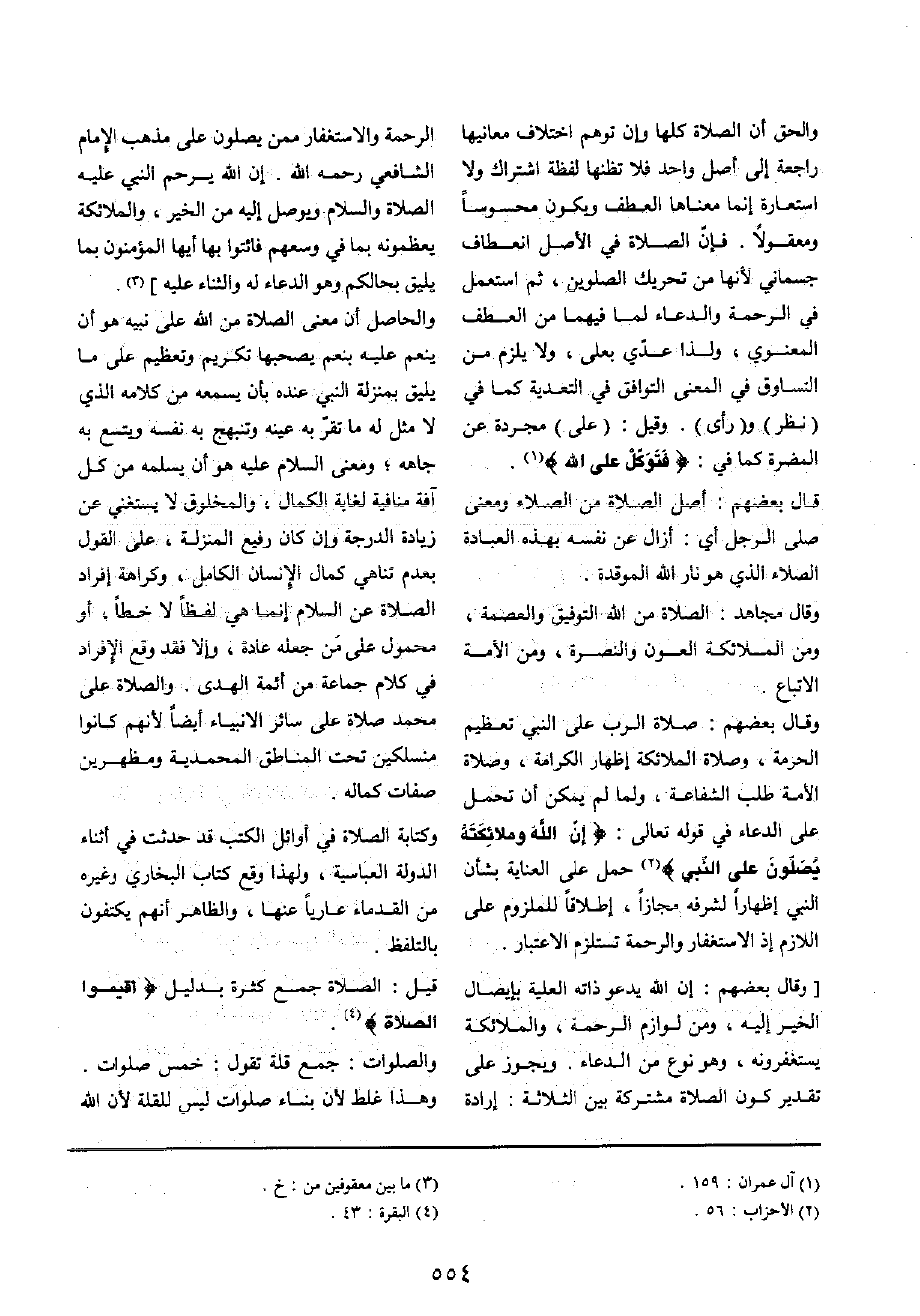 [وَقَالَ بَعضهم: إِن الله يَدْعُو ذَاته الْعلية بإيصال الْخَيْر إِلَيْهِ، وَمن لَوَازِم الرَّحْمَة، وَالْمَلَائِكَة يستغفرونه، وَهُوَ نوع من الدُّعَاء وَيجوز على تَقْدِير كَون الصَّلَاة مُشْتَركَة بَين الثَّلَاثَة: إِرَادَة الرَّحْمَة وَالِاسْتِغْفَار مِمَّن يصلونَ على مَذْهَب الإِمَام الشَّافِعِي رَحمَه الله إِن الله يرحم النَّبِي عَلَيْهِ الصَّلَاة وَالسَّلَام ويوصل إِلَيْهِ من الْخَيْر، وَالْمَلَائِكَة يعظمونه بِمَا فِي وسعهم فائتوا بهَا أَيهَا الْمُؤمنِينَ بِمَا يَلِيق بحالكم وَهُوَ الدُّعَاء لَهُ وَالثنَاء عَلَيْهِ]