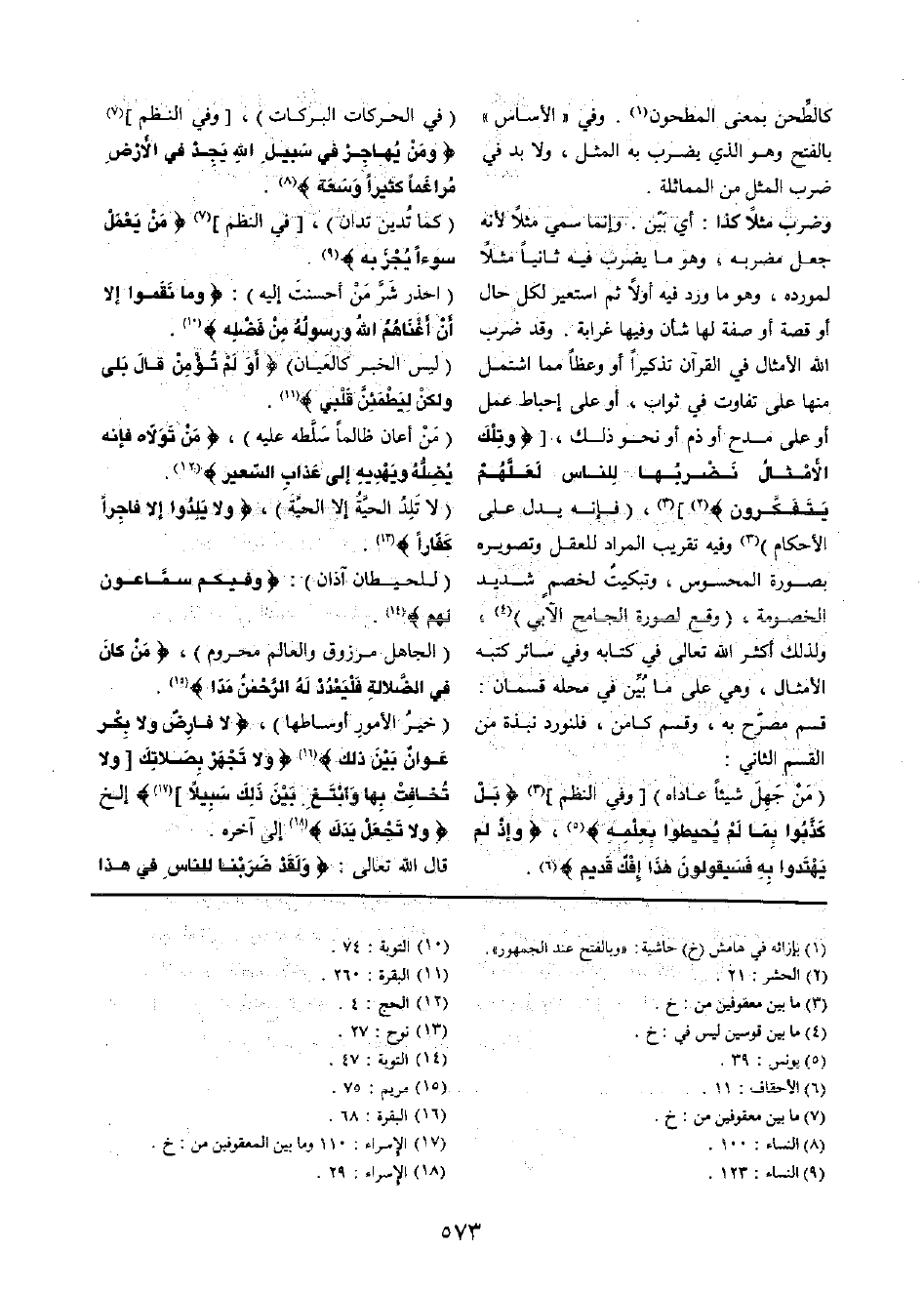 وَقد ضرب الله الْأَمْثَال فِي الْقُرْآن تذكيرا أَو وعظا مِمَّا اشْتَمَل مِنْهَا على تفَاوت فِي ثَوَاب، أَو على إحباط عمل أَو على مدح أَو ذمّ أَو نَحْو ذَلِك، [ {وَتلك الْأَمْثَال نَضْرِبهَا للنَّاس لَعَلَّهُم يتفكرون} ] ، (فَإِنَّهُ يدل على الْأَحْكَام) وَفِيه تقريب المُرَاد لِلْعَقْلِ وتصويره بِصُورَة المحسوس، وتبكيت لخصم شَدِيد الْخُصُومَة، (وَقع لصورة الجامح الآبي) ، وَلذَلِك أَكثر الله تَعَالَى فِي كِتَابه وَفِي سَائِر كتبه الْأَمْثَال، وَهِي على مَا بَين فِي مَحَله قِسْمَانِ: قسم مُصَرح بِهِ، وَقسم كامن، فلنورد نبذة من الْقسم الثَّانِي: (من جهل شَيْئا عَادَاهُ) [وَفِي النّظم] {بل كذبُوا بِمَا لم يحيطوا بِعِلْمِهِ} ، {وَإِذ لم يهتدوا بِهِ فسيقولون هَذَا إفْك قديم}