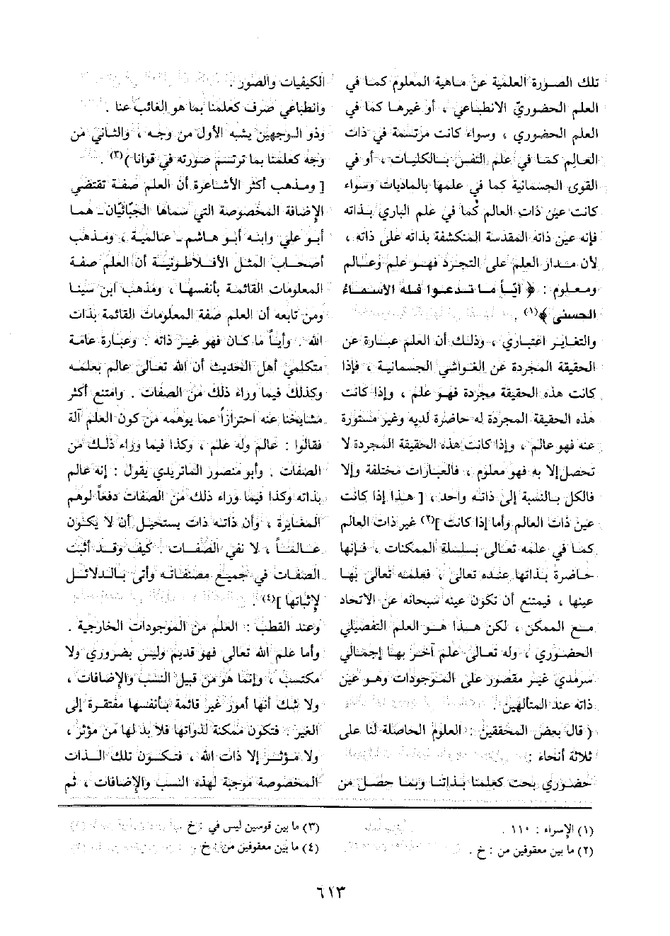 [وَمذهب أَكثر الأشاعرة أَن الْعلم صفة تَقْتَضِي الْإِضَافَة الْمَخْصُوصَة الَّتِي سَمَّاهَا الجباثيان - هما أَبُو عَليّ وَابْنه أَبُو هَاشم - عالمية، وَمذهب أَصْحَاب الْمثل الأفلاطونية أَن الْعلم صفة المعلومات الْقَائِمَة بأنفسها، وَمذهب ابْن سينا وَمن تَابعه أَن الْعلم صفة المعلومات الْقَائِمَة بِذَات الله وأيا مَا كَانَ فَهُوَ غير ذَاته وَعبارَة عَامَّة متكلمي أهل الحَدِيث أَن الله تَعَالَى عَالم بِعِلْمِهِ وَكَذَلِكَ فِيمَا وَرَاء ذَلِك من الصِّفَات وَامْتنع أَكثر مَشَايِخنَا عَنهُ احْتِرَازًا عَمَّا يُوهِمهُ من كَون الْعلم آلَة فَقَالُوا: عَالم وَله علم، وَكَذَا فِيمَا وَرَاء ذَلِك من الصِّفَات وَأَبُو مَنْصُور الماتريدي يَقُول: إِنَّه عَالم بِذَاتِهِ وَكَذَا فِيمَا وَرَاء ذَلِك من الصِّفَات دفعا لوهم الْمُغَايرَة، وَأَن ذَاته ذَات يَسْتَحِيل أَن لَا يكون عَالما، لَا نفي الصِّفَات كَيفَ وَقد أثبت الصِّفَات فِي جَمِيع مصنفاته وأتى بالدلائل لإثباتها]