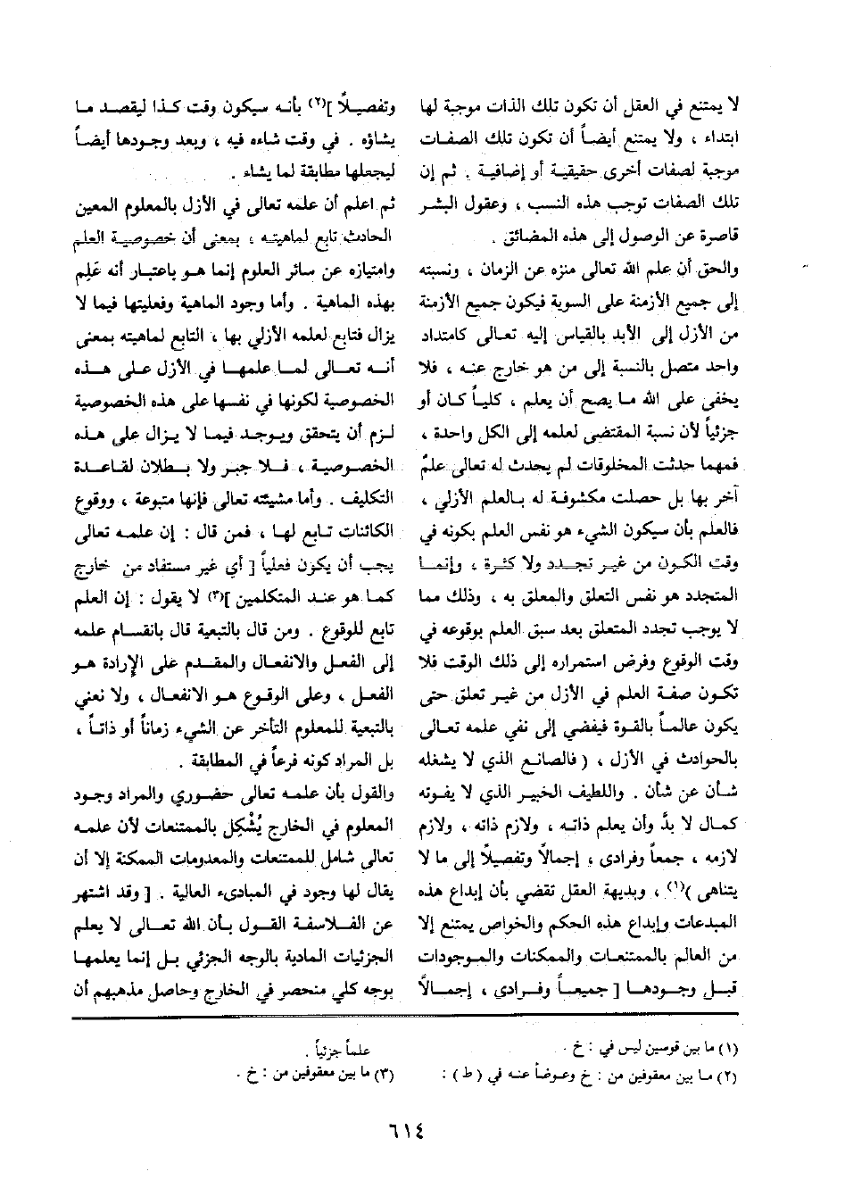 وَالْحق أَن علم الله تَعَالَى منزه عَن الزَّمَان، ونسبته إِلَى جَمِيع الْأَزْمِنَة على السوية فَيكون جَمِيع الْأَزْمِنَة من الْأَزَل إِلَى الْأَبَد بِالْقِيَاسِ إِلَيْهِ تَعَالَى كامتداد وَاحِد مُتَّصِل بِالنِّسْبَةِ إِلَى من هُوَ خَارج عَنهُ، فَلَا يخفى على الله مَا يَصح أَن يعلم، كليا كَانَ أَو جزئيا لِأَن نِسْبَة الْمُقْتَضى لعلمه إِلَى الْكل وَاحِدَة، فمهما حدثت الْمَخْلُوقَات لم يحدث لَهُ تَعَالَى علم آخر بهَا بل حصلت مكشوفة لَهُ بِالْعلمِ الأزلي، فالعلم بِأَن سَيكون الشَّيْء هُوَ نفس الْعلم بِكَوْنِهِ فِي وَقت الْكَوْن من غير تجدّد وَلَا كَثْرَة، وَإِنَّمَا المتجدد هُوَ نفس التَّعَلُّق وَالْمُعَلّق بِهِ، وَذَلِكَ مِمَّا لَا يُوجب تجدّد الْمُتَعَلّق بعد سبق الْعلم بِوُقُوعِهِ فِي وَقت الْوُقُوع وَفرض استمراره إِلَى ذَلِك الْوَقْت فَلَا تكون صفة الْعلم فِي الْأَزَل من غير تعلق حَتَّى يكون عَالما بِالْقُوَّةِ فيفضي إِلَى نفي علمه تَعَالَى بالحوادث فِي الْأَزَل، (فالصانع الَّذِي لَا يشْغلهُ شَأْن عَن شَأْن واللطيف الْخَبِير الَّذِي لَا يفوتهُ كَمَال لَا بُد وَأَن يعلم ذَاته، ولازم ذَاته، ولازم لَازمه، جمعا وفرادى، إِجْمَالا وتفصيلا إِلَى مَا لَا يتناهى) ، وبديهة الْعقل تقضي بِأَن إبداع هَذِه المبدعات وإبداع هَذِه الحكم والخواص يمْتَنع إِلَّا من الْعَالم بالممتنعات والممكنات والموجودات قبل وجودهَا [جَمِيعًا وفرادى، إِجْمَالا وتفصيلا] بِأَنَّهُ سَيكون وَقت كَذَا ليقصد مَا يشاؤه فِي وَقت شاءه فِيهِ، وَبعد وجودهَا أَيْضا ليجعلها مُطَابقَة لما يَشَاء