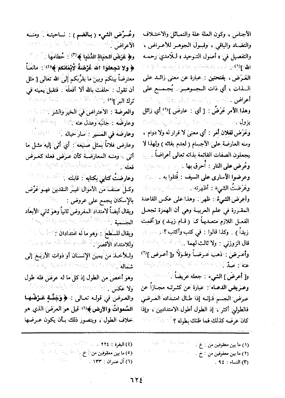 وَعرض لفُلَان أَمر: أَي معنى لَا قَرَار لَهُ وَلَا دوَام، وَمِنْه الْعَارِضَة على الْأَجْسَام (لعدم بَقَائِهِ) وَلِهَذَا لَا يجْعَلُونَ الصِّفَات الْقَائِمَة بِذَاتِهِ تَعَالَى أعراضا وَعرض على النَّار: أحرق بهَا