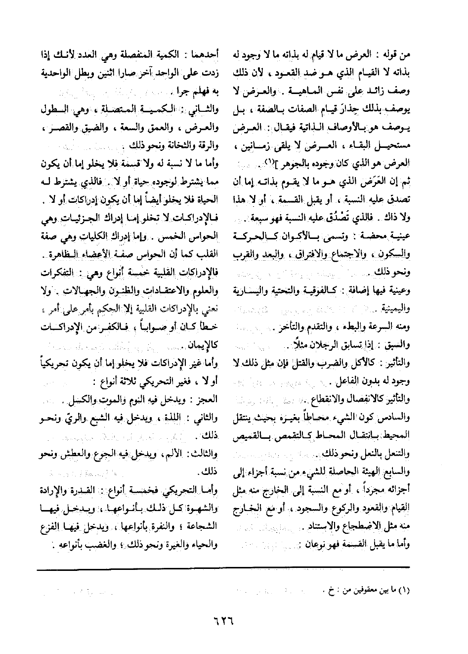 وَأما مَا لَا نِسْبَة لَهُ وَلَا قسْمَة فَلَا يَخْلُو إِمَّا أَن يكون مِمَّا يشْتَرط لوُجُوده حَيَاة أَو لَا فَالَّذِي يشْتَرط لَهُ الْحَيَاة فَلَا يَخْلُو أَيْضا إِمَّا أَن يكون إدراكات أَو لَا