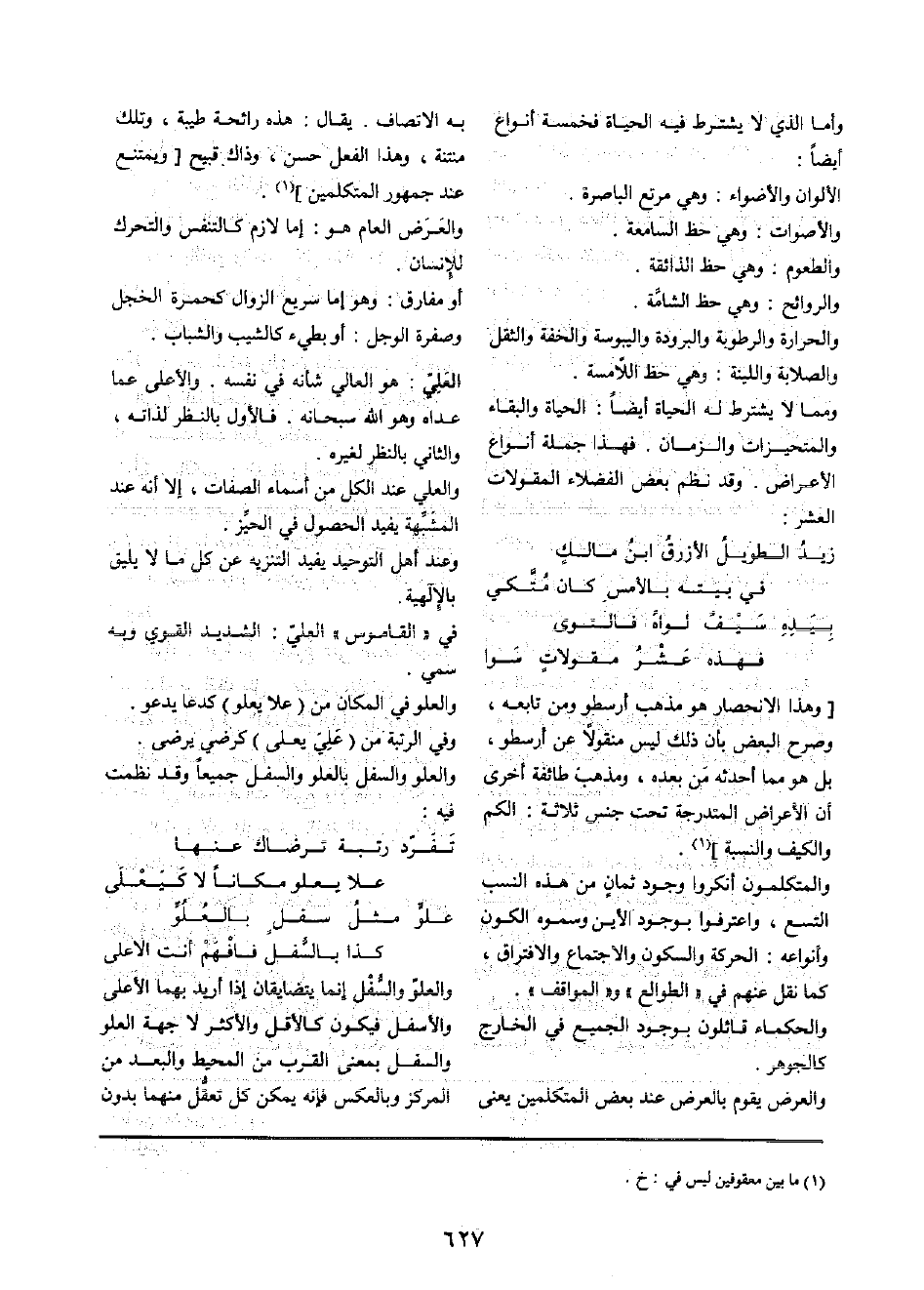 [وَهَذَا الانحصار هُوَ مَذْهَب أرسطو وَمن تَابعه، وَصرح الْبَعْض بِأَن ذَلِك لَيْسَ مَنْقُولًا عَن أرسطو، بل هُوَ مِمَّا أحدثه من بعده، وَمذهب طَائِفَة أُخْرَى أَن الْأَعْرَاض المتدرجة تَحت جنس ثَلَاثَة: الْكمّ والكيف وَالنِّسْبَة]