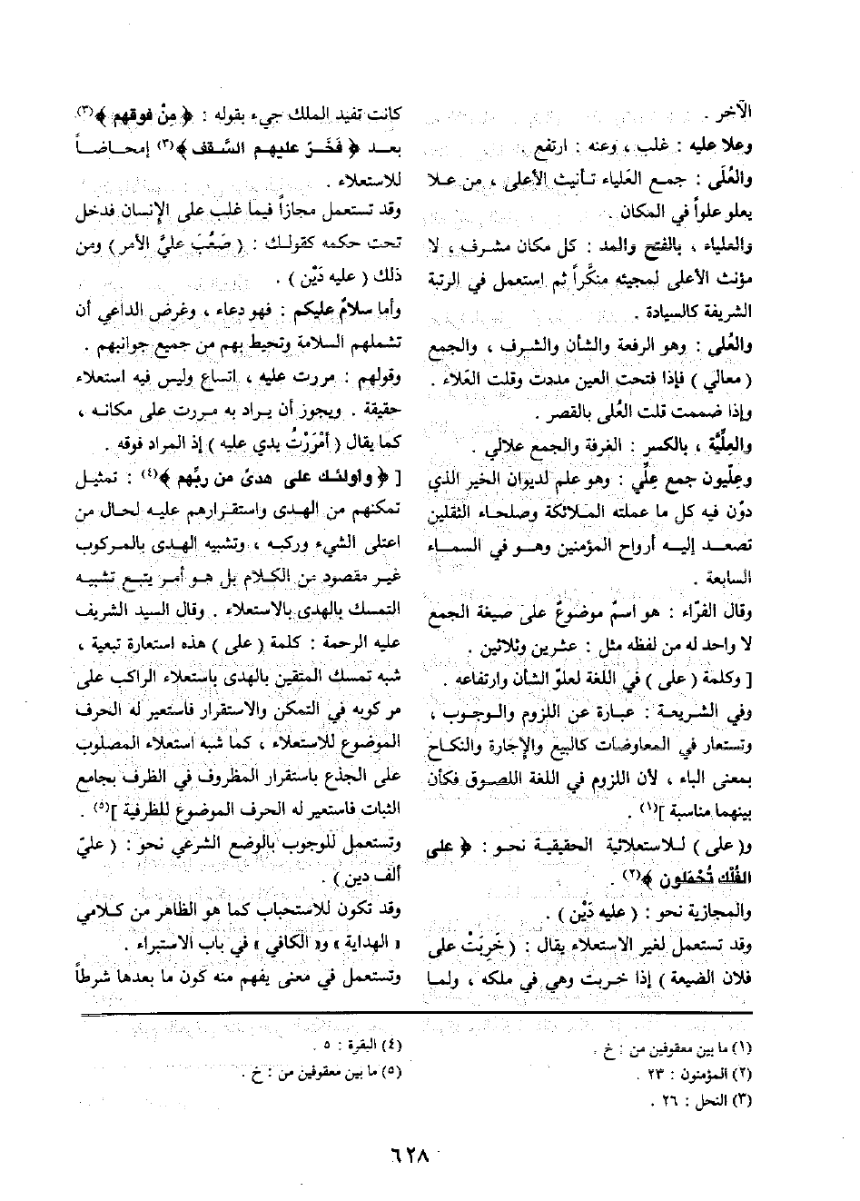 و (على) للاستعلائية الْحَقِيقِيَّة نَحْو: {على الْفلك تحملون}