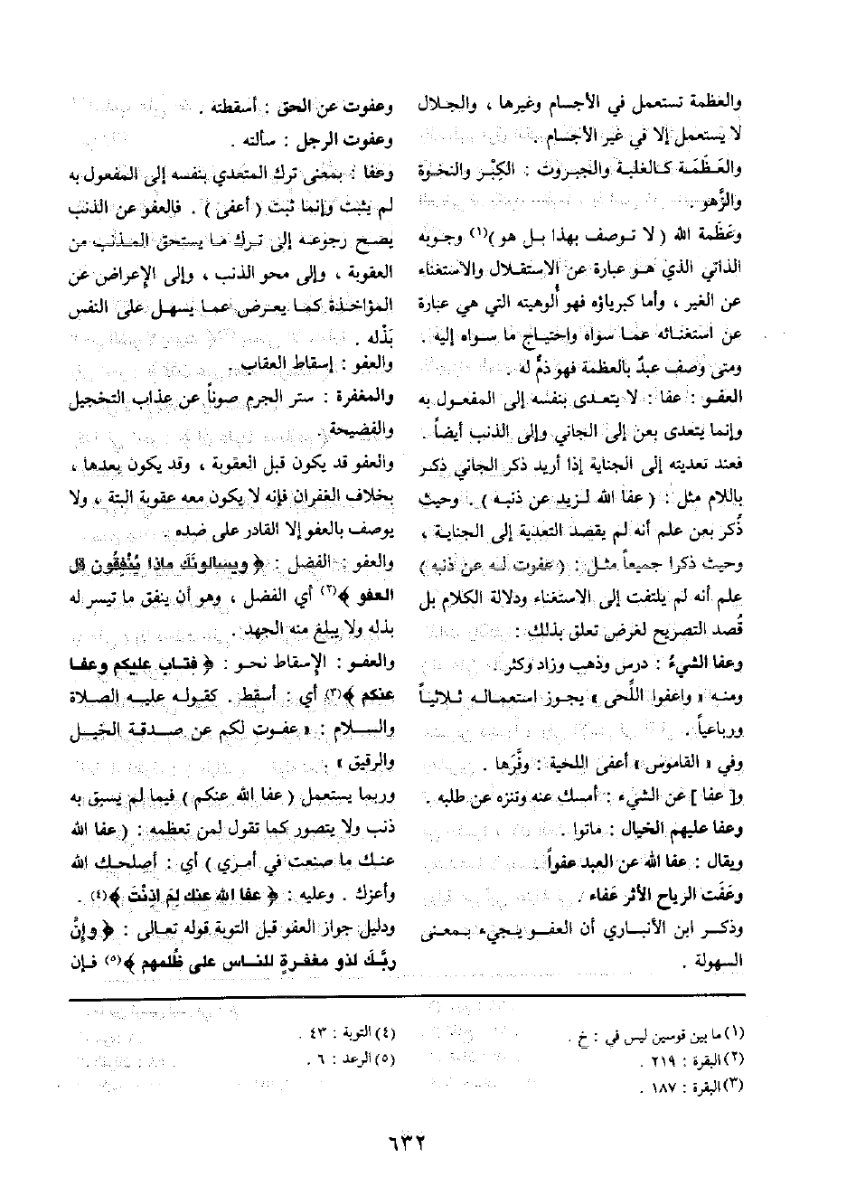 وَالْعَفو: الْإِسْقَاط نَحْو: {فَتَابَ عَلَيْكُم وَعَفا عَنْكُم} أَي: أسقط كَقَوْلِه عَلَيْهِ الصَّلَاة وَالسَّلَام: " عَفَوْت لكم عَن صَدَقَة الْخَيل وَالرَّقِيق "