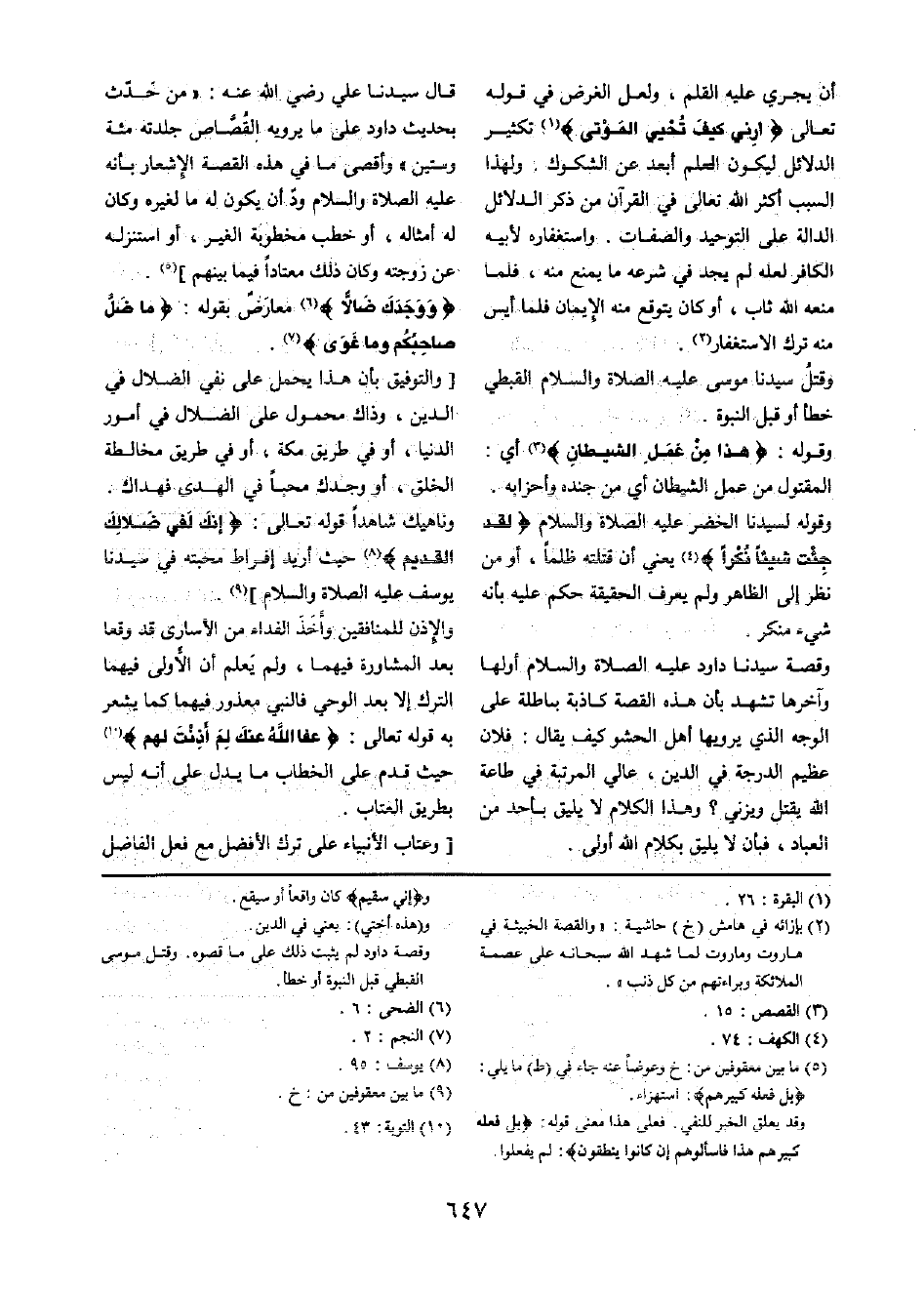 قَالَ سيدنَا عَليّ رَضِي الله عَنهُ: " من حدث بِحَدِيث دَاوُد على مَا يرويهِ الْقصاص جلدته مئة وَسِتِّينَ " وأقصى مَا فِي هَذِه الْقِصَّة الْإِشْعَار بِأَنَّهُ عَلَيْهِ الصَّلَاة وَالسَّلَام ود أَن يكون لَهُ مَا لغيره، وَكَانَ لَهُ أَمْثَاله، أَو خطب مخطوبة الْغَيْر، أَو استنزله عَن زَوجته وَكَانَ ذَلِك مُعْتَادا فِيمَا بَينهم] {ووجدك ضَالًّا} معَارض بقوله: {مَا ضل صَاحبكُم وَمَا غوى} [والتوفيق بِأَن هَذَا يحمل على نفي الضلال فِي الدّين، وَذَاكَ مَحْمُول على الضلال فِي أُمُور الدُّنْيَا، أَو فِي طَرِيق مَكَّة، أَو فِي طَرِيق مُخَالطَة الْخلق، أَو وَجدك محبا فِي الْهدى فهداك