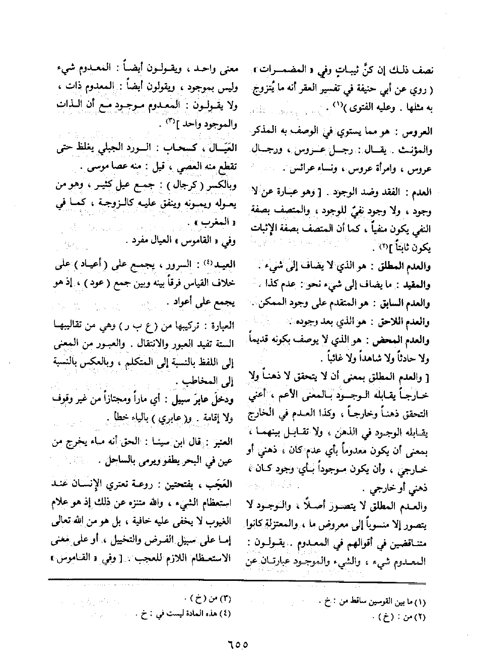 الْعَدَم: الْفَقْد وضد الْوُجُود [وَهُوَ عبارَة عَن لَا وجود، وَلَا وجود نفي للوجود، والمتصف بِصفة النَّفْي يكون منفيا، كَمَا أَن المتصف بِصفة الْإِثْبَات يكون ثَابتا]