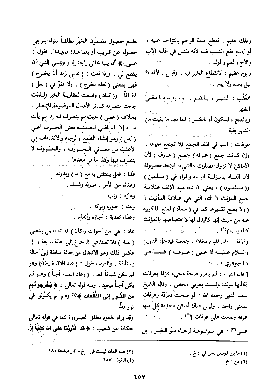[قَالَ الْفراء: لم يَتَقَرَّر صِحَة مَجِيء عَرَفَة بِعَرَفَات فَكَأَنَّهَا مولدة وَلَيْسَت بعربي مَحْض وَقَالَ الشَّيْخ سعد الدّين رَحمَه الله: لَو صحت فعرفة وعرفات بِمَعْنى وَاحِد، وَلَيْسَ هُنَاكَ أَمَاكِن مُتعَدِّدَة كل مِنْهَا عَرَفَة جمعت على عَرَفَات]