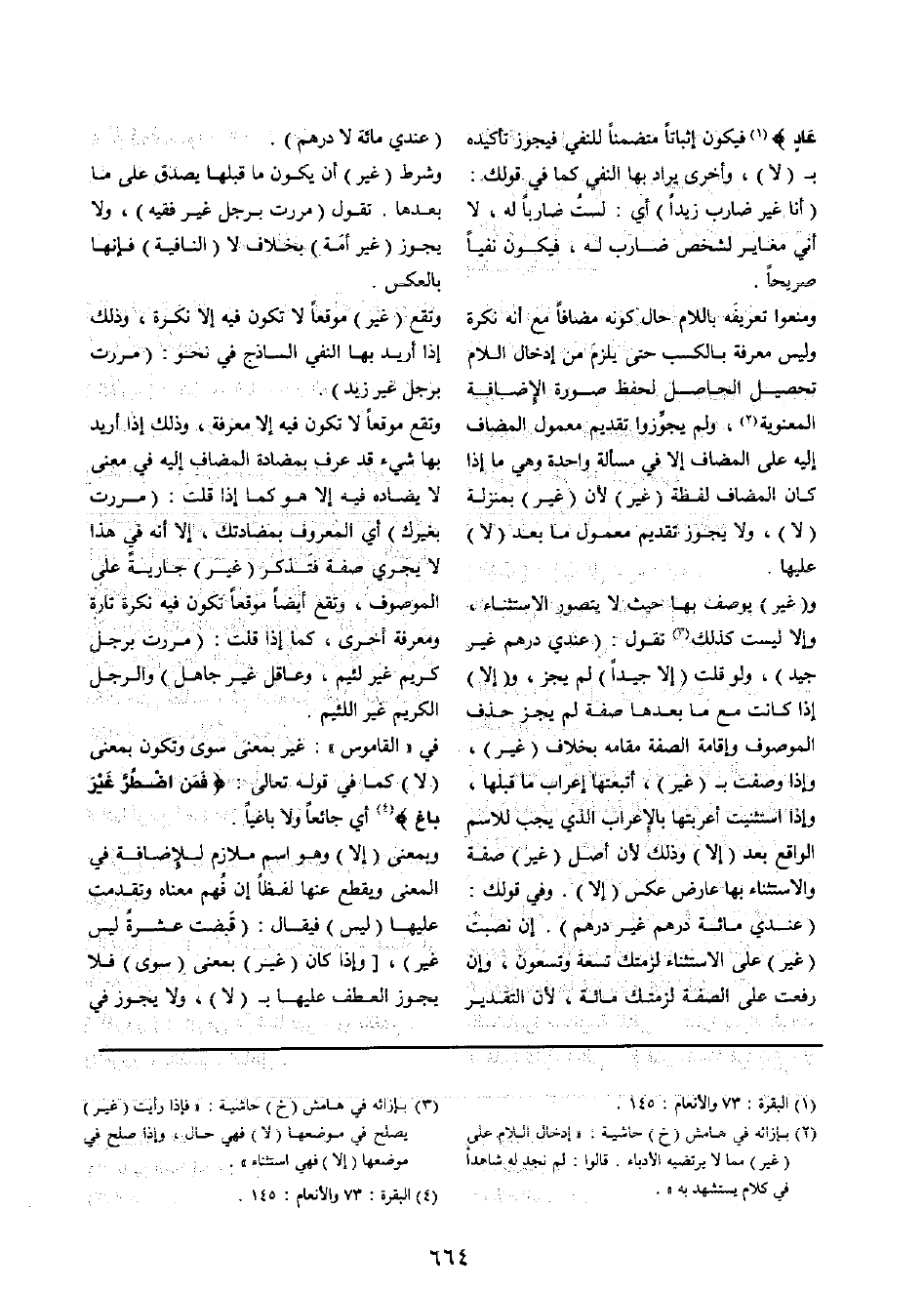 عَاد} فَيكون إِثْبَاتًا متضمنا للنَّفْي فَيجوز تأكيده ب (لَا) ، وَأُخْرَى يُرَاد بهَا النَّفْي كَمَا فِي قَوْلك: (أَنا غير ضَارب زيدا) أَي: لست ضَارِبًا لَهُ، لَا أَنِّي مُغَاير لشخص ضَارب لَهُ، فَيكون نفيا صَرِيحًا