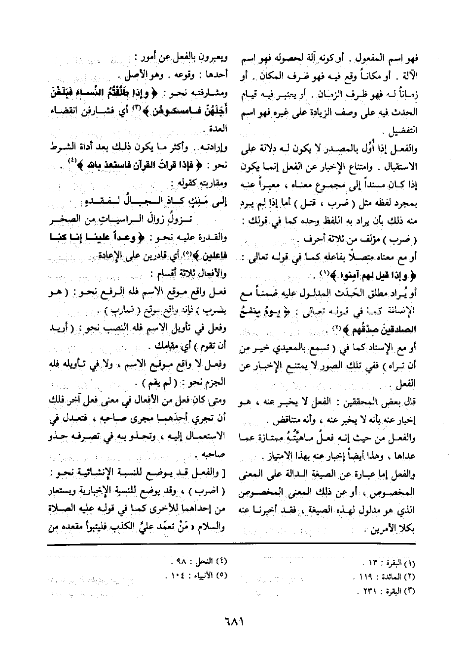 وَالْفِعْل إِمَّا عبارَة عَن الصِّيغَة الدَّالَّة على الْمَعْنى الْمَخْصُوص، أَو عَن ذَلِك الْمَعْنى الْمَخْصُوص الَّذِي هُوَ مَدْلُول لهَذِهِ الصِّيغَة، فقد أخبرنَا عَنهُ بكلا الْأَمريْنِ ويعبرون بِالْفِعْلِ عَن أُمُور: أَحدهَا: وُقُوعه وَهُوَ الأَصْل ومشارفته نَحْو: {وَإِذا طلّقْتُم النِّسَاء فبلغن أَجلهنَّ فأمسكوهن} أَي فشارفن انْقِضَاء الْعدة