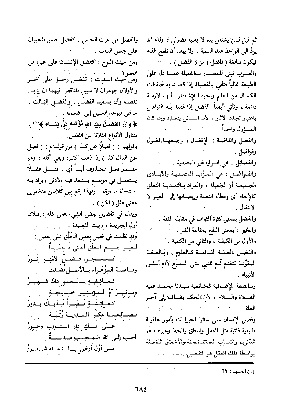 وَمن حَيْثُ الذَّات: كفضل رجل على آخر والأولان جوهران لَا سَبِيل للناقص فيهمَا أَن يزِيل نَقصه وَأَن يَسْتَفِيد الْفضل وَالْفضل الثَّالِث: عرض فيوجد السَّبِيل إِلَى اكتسابه {وَأَن الْفضل بيد الله يؤتيه من يَشَاء} : يتَنَاوَل الْأَنْوَاع الثَّلَاثَة من الْفضل